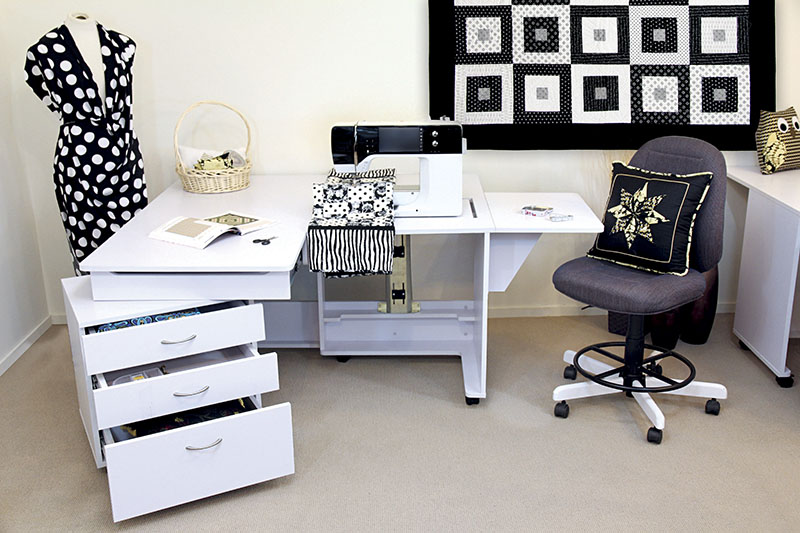 Стол для швейной машины с раскройным местом QUILTERS VISION. Компактный рабочий кабинет швеи. Это идеальное рабочее место для любого, кто занимается квилтингом на любом уровне профессионализма. Платформа под швейную машинку 615 х 320 мм, оснащена гидравлическим подъемником. Грузоподъемность 19 кг, 500 ньютонов. Удобная задняя раскладная панель для стежки, большой стол для раскроя ткани.