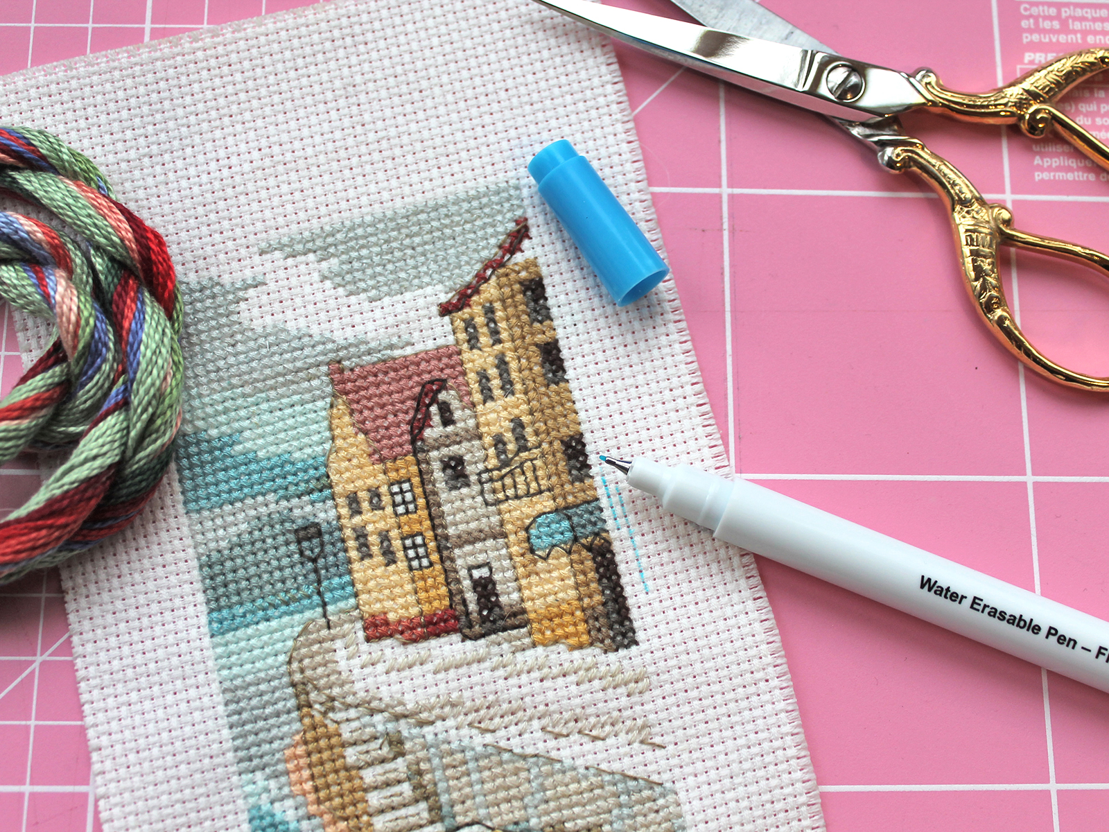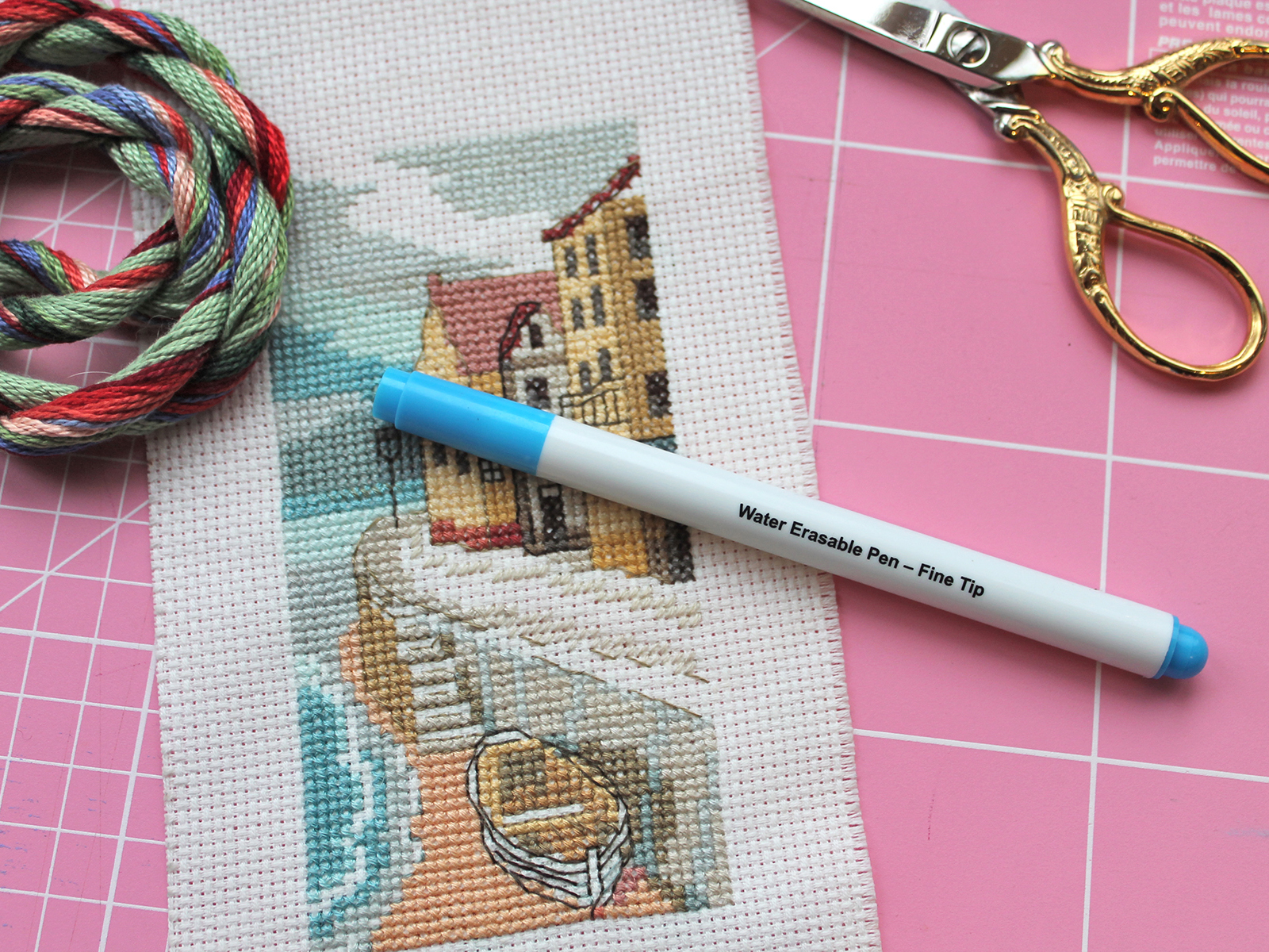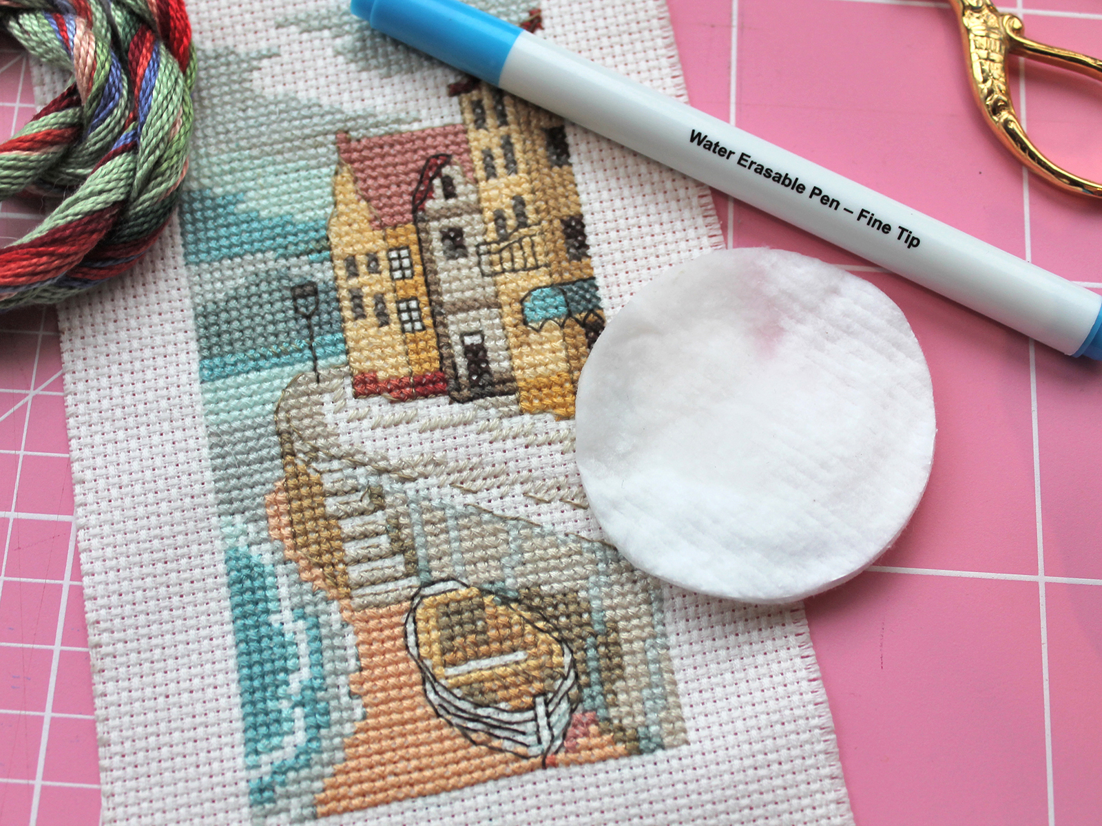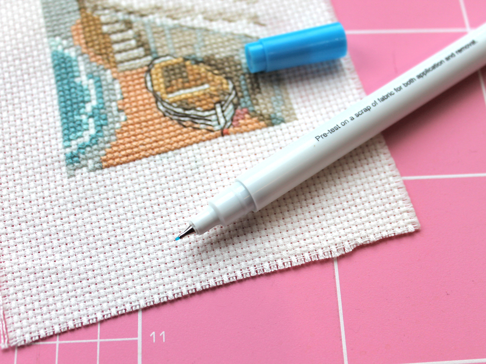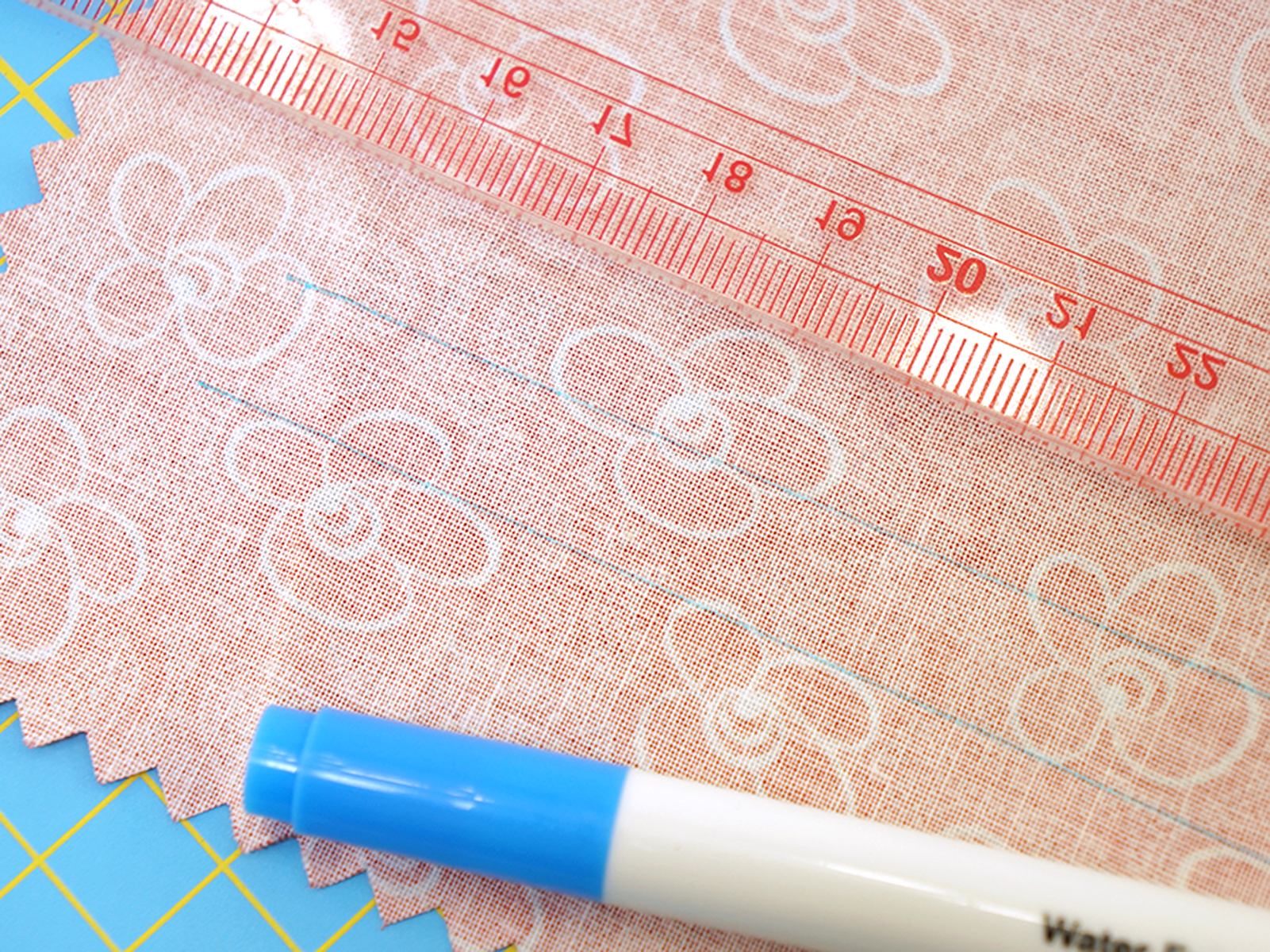 Линия маркера голубого цвета, очень тонкая - толщиной 0,5 мм. При необходимости линии с ткани удаляйте, погрузив ткань в прохладную воду или при помощи влажной губки, салфетки или ватного диска.
