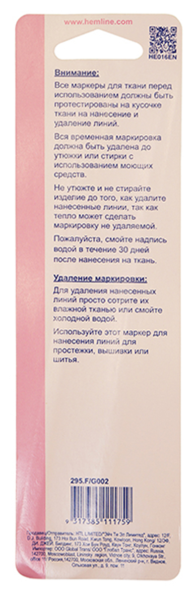 Маркер HEMLINE предназначен для временной разметки на светлой ткани, канве, для нанесения контурных линий выкройки при крое или в пэчворке, для разметки в квилтинге.
