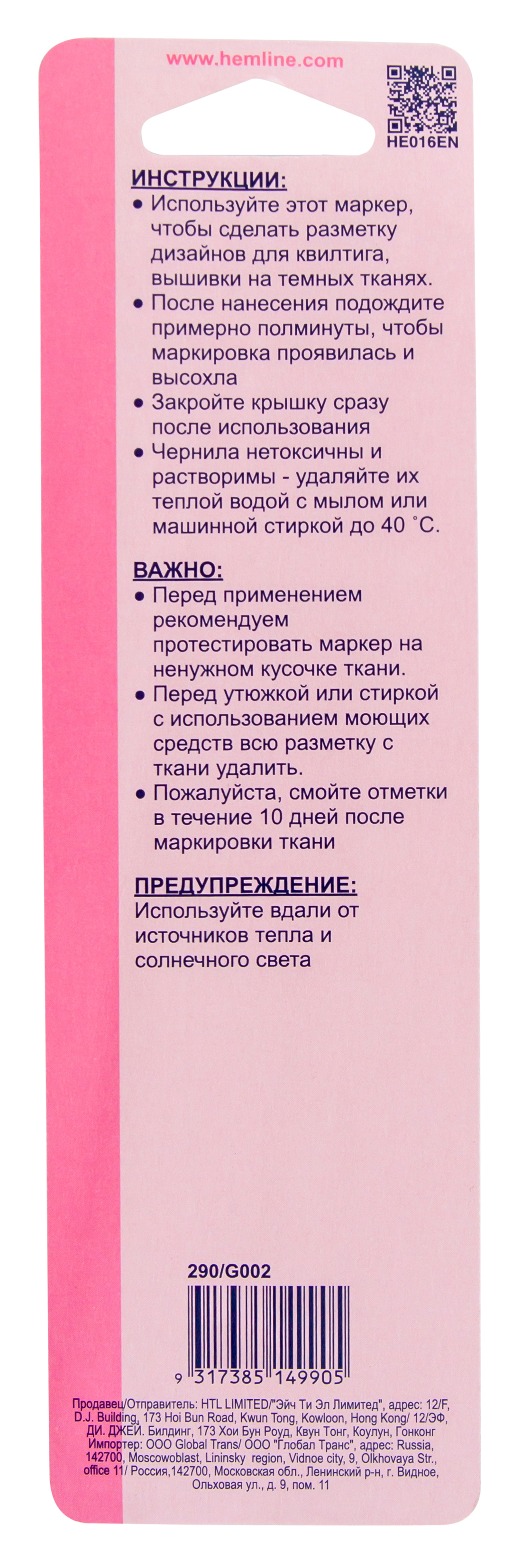 Маркер HEMLINE белого цвета предназначен для временной разметки на темной ткани, канве, для нанесения контурных линий выкройки при крое или в пэчворке, для разметки стежки в квилтинге. Линия маркера белого цвета, толщина - 1 мм. После нанесения линий маркером подождите около минуты, чтобы линии проявились на темной ткани. При необходимости линии с ткани удаляйте, погрузив ткань в воду до 40 град. (можно в мыльный раствор) или при помощи влажной губки, салфетки или ватного диска. Внимание! Перед утюжкой или стиркой с использованием моющих средств, всю разметку с ткани нужно предварительно удалить. Перед применением рекомендуем протестировать маркер на ненужном кусочке ткани. Не оставляйте разметку дольше 10 дней. Важно: не храните маркер при минусовой температуре, не оставляйте маркер без колпачка на долгое время - незакрытый маркер быстрее высохнет, храните маркер в вертикальном положении стержнем вниз.