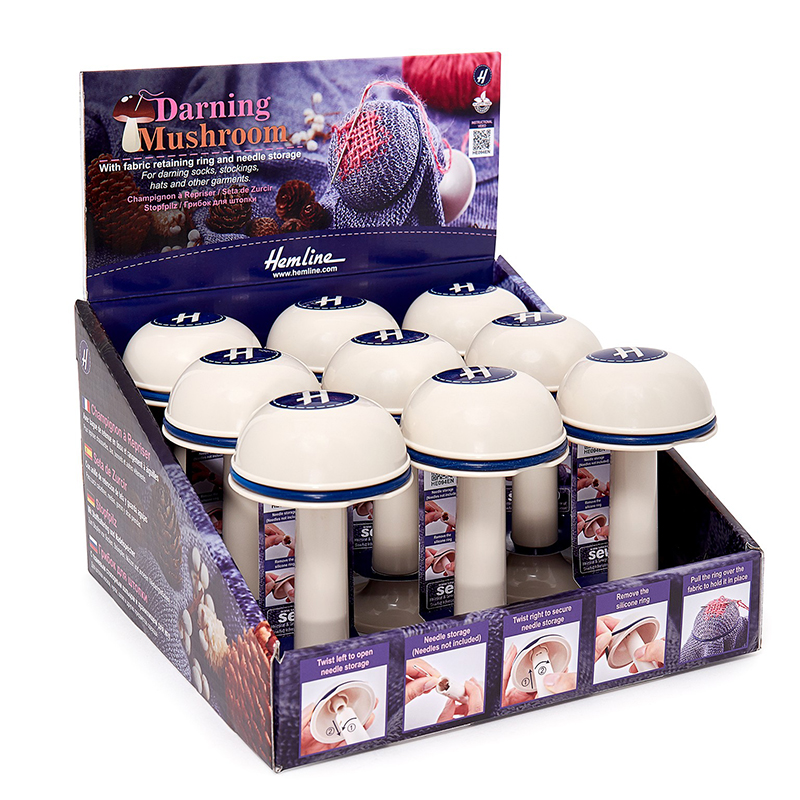Грибок для штопки в картонном цветном прикассовом стенде используется для штопки носков, чулок, шляп и другой одежды. Удерживается на любой плоской поверхности, оставляя обе руки свободными. Имеет удерживающее ткань силиконовое кольцо для удержания ткани на месте. Съемная ручка может использоваться как игольница для хранения ваших швейных игл. Цвет грибка: кремовый/темно-синий. Размеры грибка: колпачок диаметром 6,4 см, ручка длиной 8,5 см с основанием. Размеры картонного стенда: W20 x D20 x H22 см. Вес брутто: 560 г. В стенде 9 брибков.