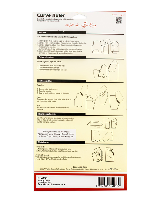 Портновское лекало предназначено для профессионалов и любителей, является универсальным инструментом. Схемы на блистерной упаковке помогут вам сориентироваться какой край лекала для какого элемента конструирования применяется.