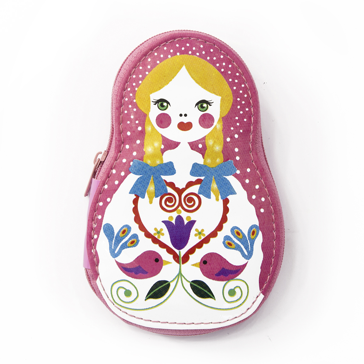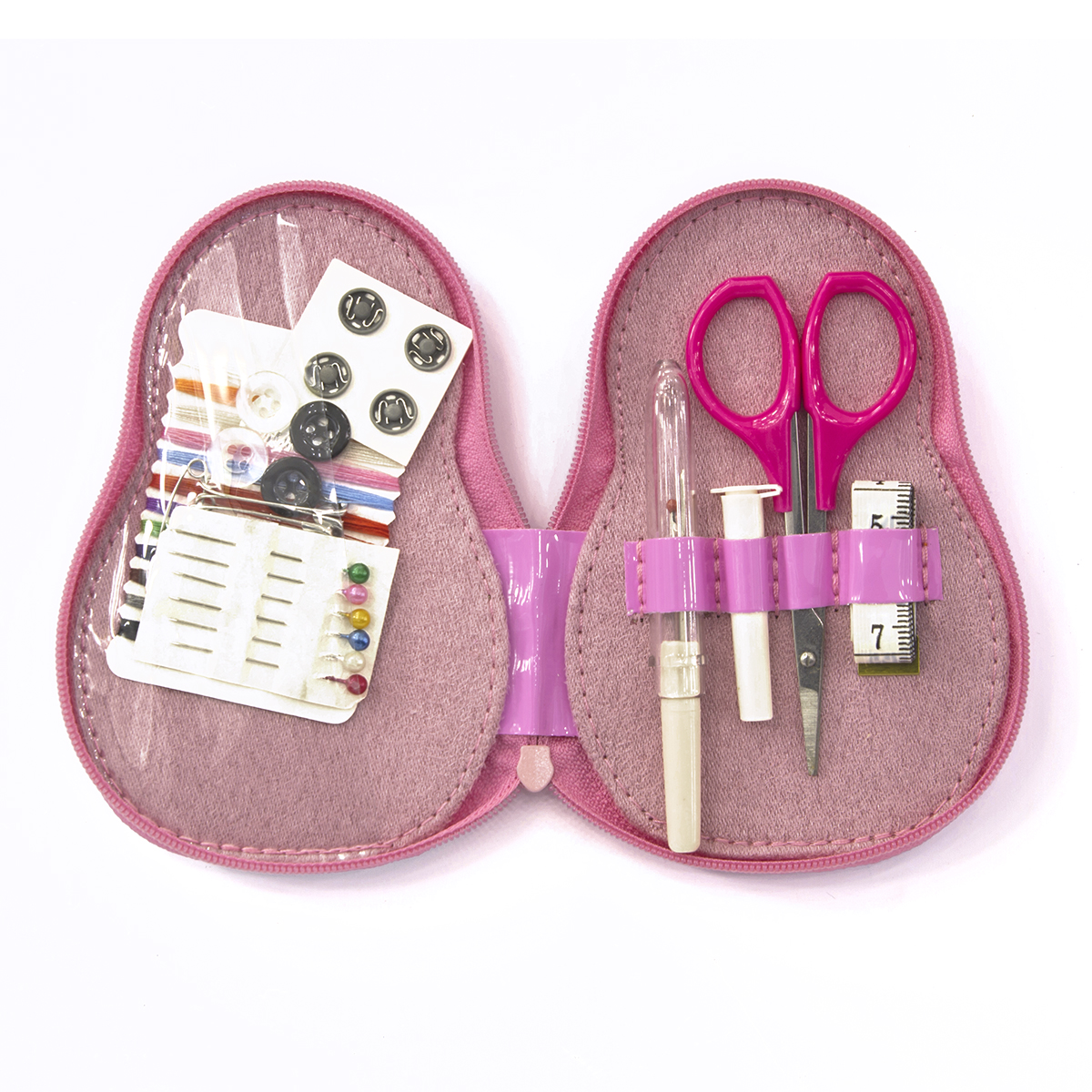 Плотно закрывающийся футляр на молнии со швейными аксессуарами - необходимая вещь в дороге и в домашнем хозяйстве. Является минимально необходимым набором для скорого ремонта одежды. В состав входят: картонная шпуля с подмотками нитей 7 разных цветов, пластиковый фурляр с ручными иглами, сантиметровая лента, вспарыватель, ножнички для подрезки нитей, 6 булавок с жемчужными головками, 4 пришивные металлические кнопки, 6 английских булавок, 2 белые и 2 черные рубашечные пуговицы. Все акссесуары надежно фиксируются внутри эластичной тесьмой. Форма и дизайн футляра в форме матрешки несомненно понравится юным рукодельницам и может стать "русским сувениром".