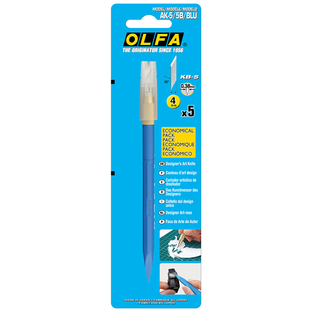 В комплекте поставляется 5 лезвий KB-5 шириной 4 мм, и игла для разметки различных материалов длиной 20 мм и диаметром 1,6 мм. Зажим лезвий осуществляется с помощью проверенной цанги из бронзового сплава (аналогично AK-3), которая обеспечивает быструю и надежную фиксацию лезвия. Ребристая форма рукоятки ножа Olfa, препятствует его скатыванию со стола. Специальный контейнер для хранения лезвий включает в себя механизм трансформации, который позволяет его использовать в качестве настольной подставки для ножа. Рукоятка на конце в форме шпателя используется для разглаживания клейких материалов и формовки различных пластичных материалов (например из глины).