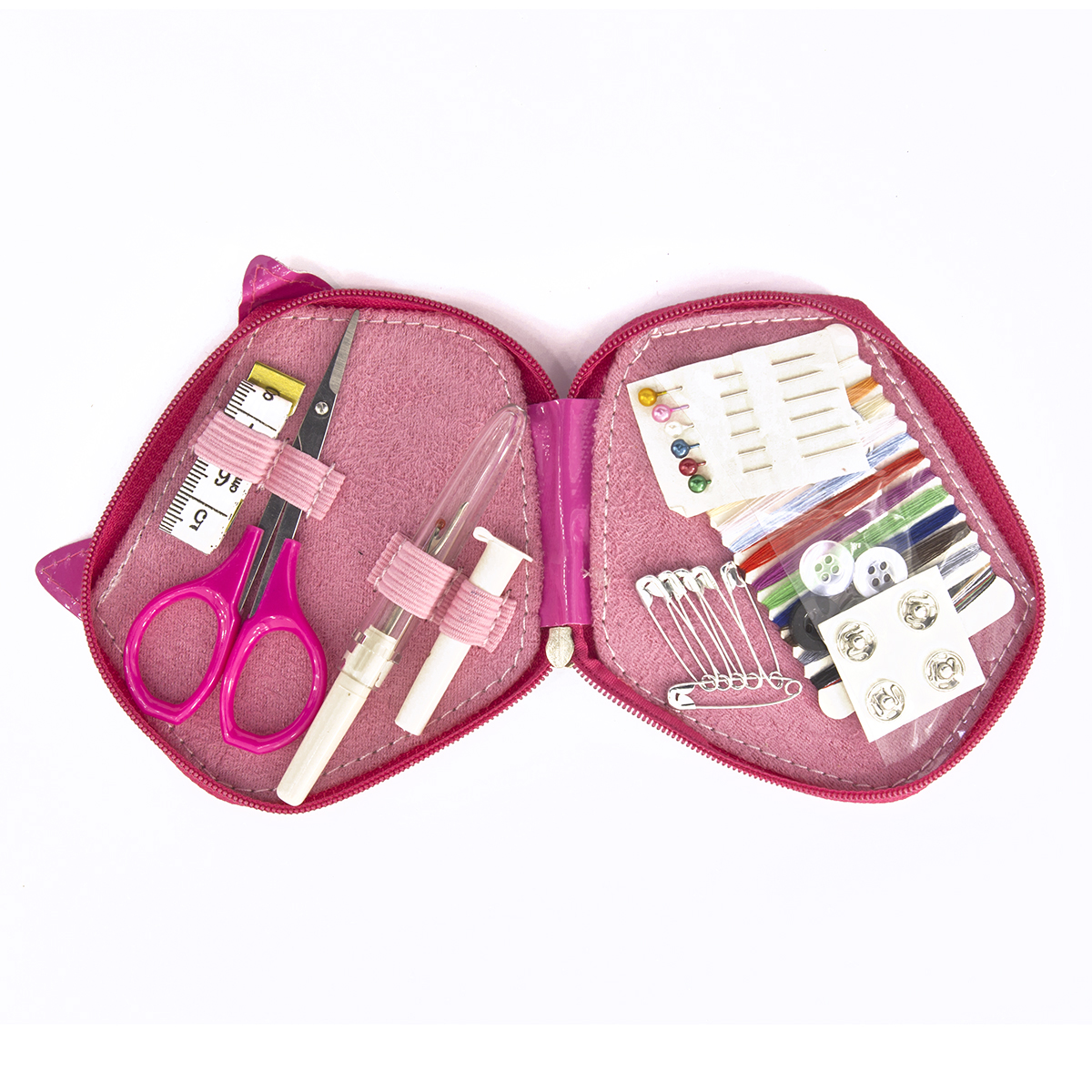 В состав входят: картонная шпуля с подмотками нитей 7 разных цветов, пластиковый фурляр с ручными иглами, сантиметровая лента, вспарыватель, ножнички для подрезки нитей, 6 булавок с жемчужными головками, 4 пришивные металлические кнопки, 2 белые и 2 черные рубашечные пуговицы. Все акссесуары надежно фиксируются внутри эластичной тесьмой. Форма и дизайн футляра в форме головы лисенка несомненно понравится юным рукодельницам.