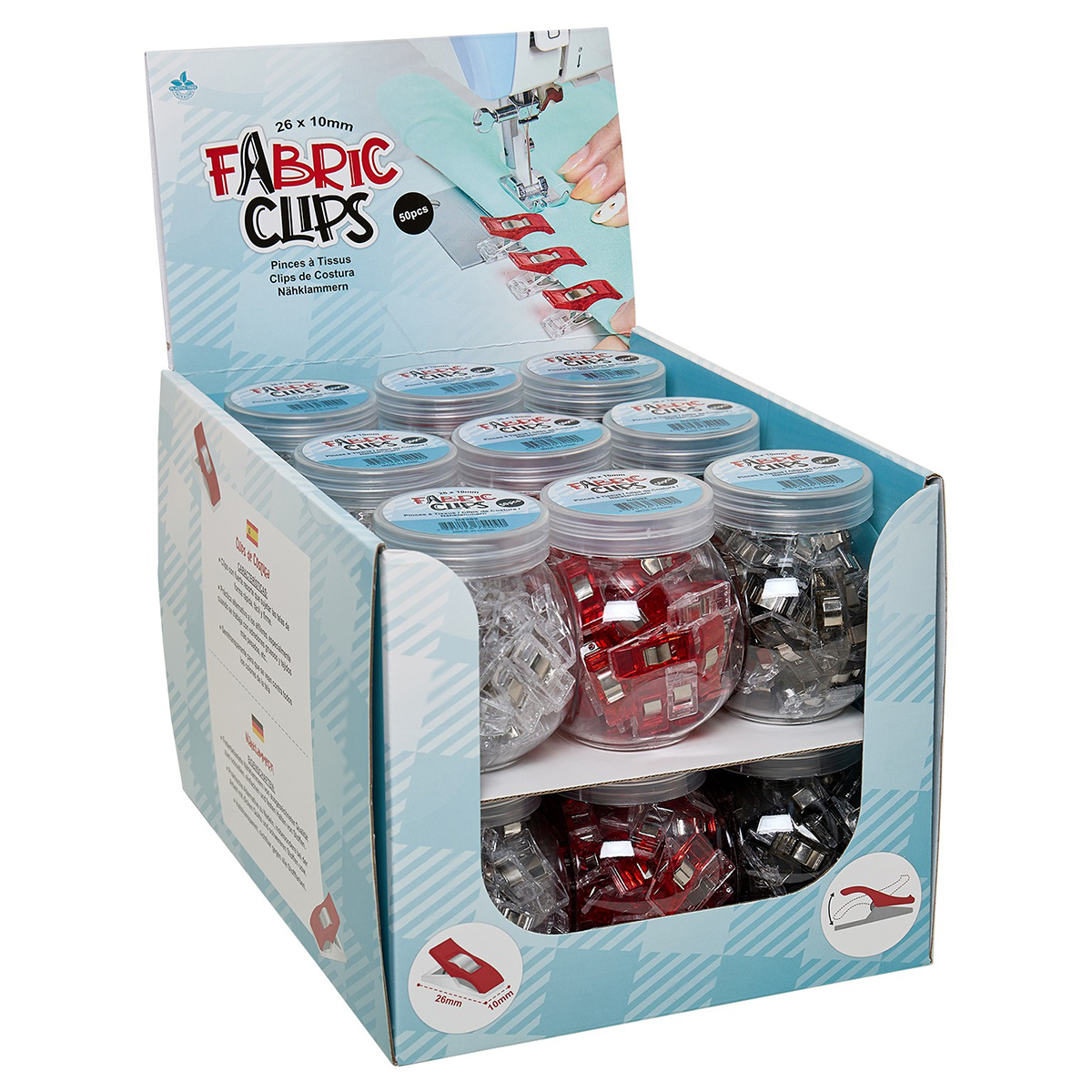 Фиксаторы изготовлены с прочной металлической пружиной, которая надежно фиксирует несколько слоев ткани, не вызывая повреждений или деформации. Быстрая альтернатива булавкам. Идеально подходит для удержания нескольких слоев ткани в любом проекте, таком как лоскутные одеяла, ручки, канты, косые полоски и т.д. Может использоваться с лоскутными изделиями с бумажными шаблонами. Прозрачные, поэтому их легко увидеть во время шитья. 50 штук в многоразовой пластиковой банке с крышкой. Размер фиксатора: 26 x 10 мм. Материал содержимого: пластик PS, пружина из нержавеющей стали. Размеры пластиковой банки: 8 x 5,5 x 8 см. Размеры дисплея (в закрытом виде): 19 x 24,5 x 17 см. Размеры дисплея (в собранном виде): 19.x 24.5 x 29 см. Вес брутто дисплея: 2 кг. В дисплее представлены 18 банок с пластиковыми крышками (по 50 фиксаторов в каждой банке): 6 банок с фиксаторами красного цвета, 6 банок с фиксаторами черного цвета, 6 банок с фиксаторами прозрачного цвета.