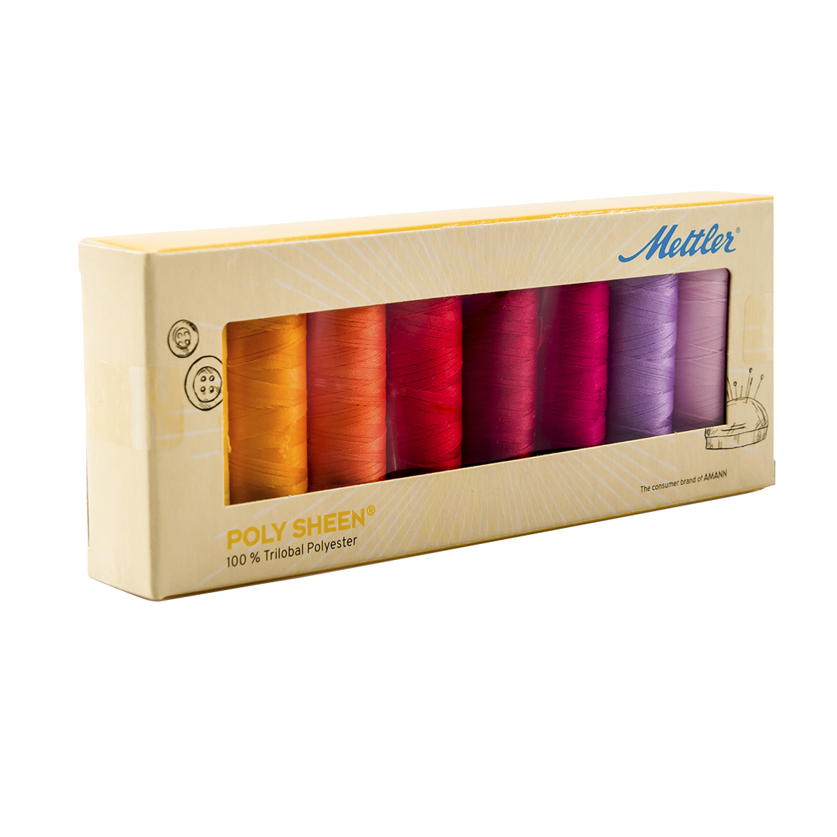 Набор с нитками Poly Sheen в подарочной упаковке, 8 катушек. POLY SHEEN - это прочная, декоративная, блестящая швейная нить, которой не только замечательно вышивать, но она универсальна благодаря своей сверхпрочной и устойчивой к истиранию текстуре. Красочные декоративные швы выигрышно смотрятся с швейной ниткой на спортивной и повседневной одежде, джинсах, детской одежде. Набор PS8Floral-Kit содержит 8 катушек по 200 м.