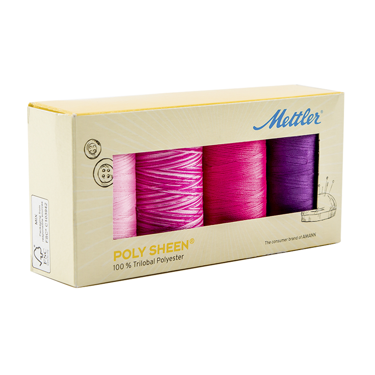 Набор с нитками Poly Sheen в подарочной упаковке, 4 катушки. POLY SHEEN - это прочная, декоративная, блестящая швейная нить, которой не только замечательно вышивать, но она универсальна благодаря своей сверхпрочной и устойчивой к истиранию текстуре. Красочные декоративные швы выигрышно смотрятся с швейной ниткой на спортивной и повседневной одежде, джинсах, детской одежде. Набор PS4BLOSSOM-KIT содержит 4 катушки по 800 м.