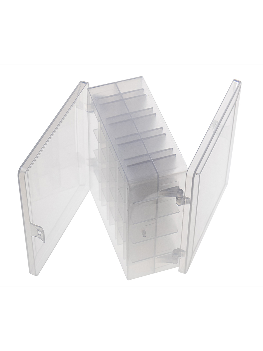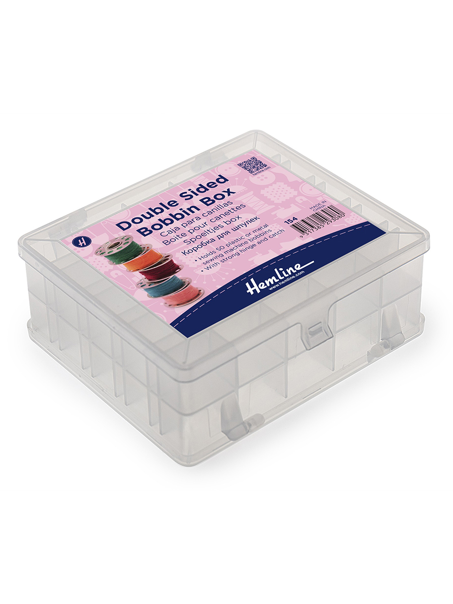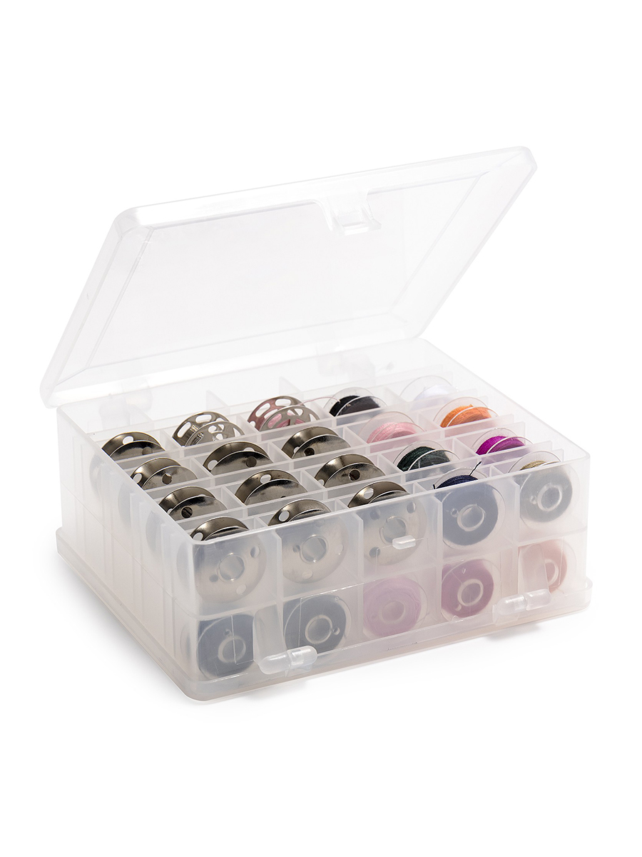 Удобный пластиковый органайзер для машинных шпуль. Вмещает до 50 пластиковых или металлических шпулей. Больше никаких спутанных ниток. Двусторонний доступ. Коробка полностью непромокаема благодаря прочным передним защелкам. Размеры изделия: 12 x 11 x 4,7 см. Вес брутто товара: 135 г.