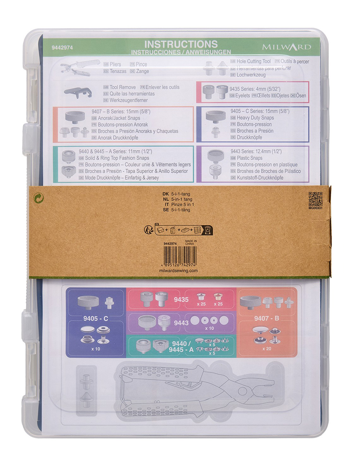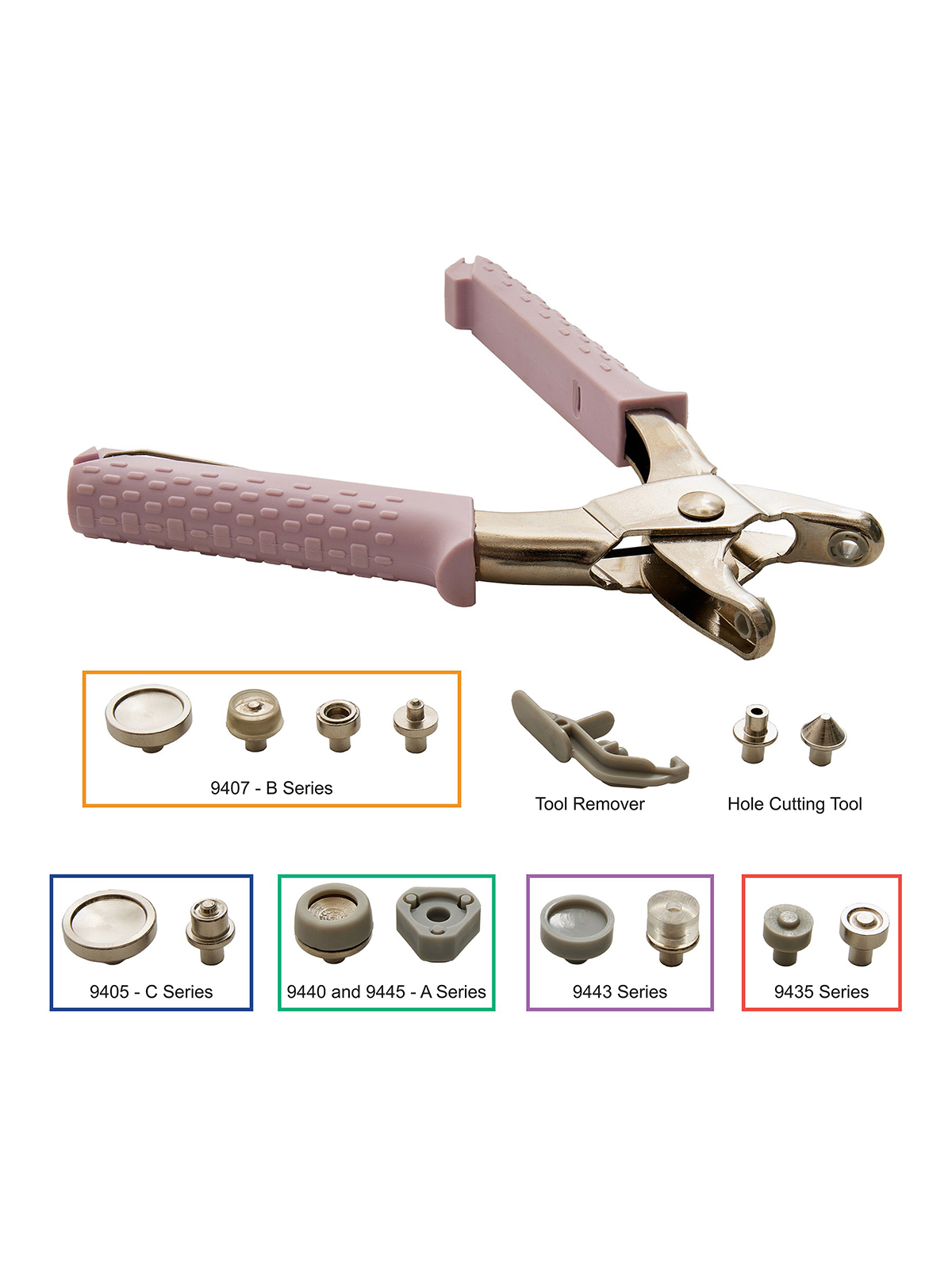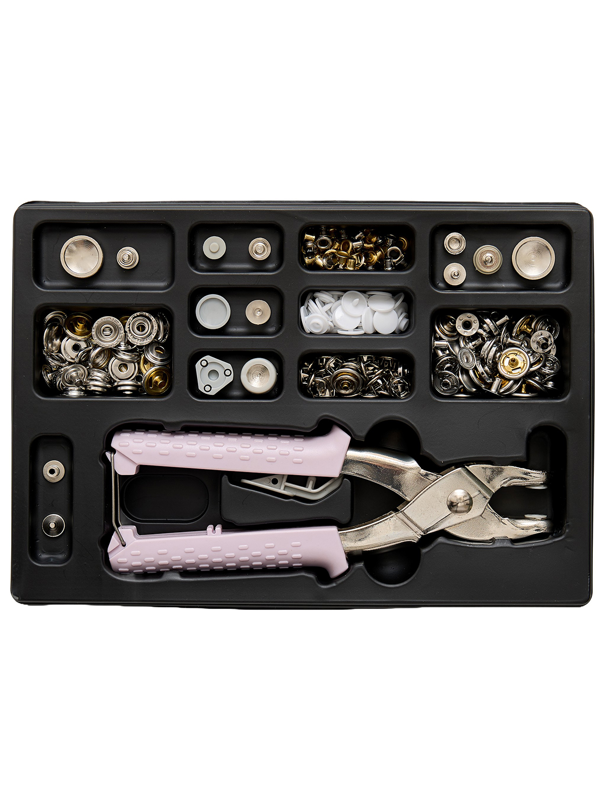 Универсальный стартовый набор 5-в-1 для изготовления прочных заклёпок, люверсов, пластиковых заклёпок, заклёпок с плоской и кольцевой головкой, а также заклёпок для анораков и курток. Одна пара плоскогубцев для всего.