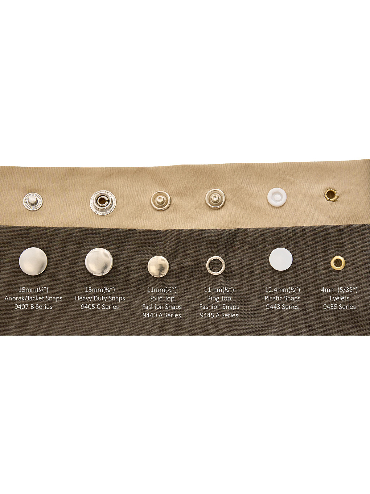 11-миллиметровые (1/2”) цельные и кольцевые верхние модные застёжки серии A (артикул 9440872, 9440889, 9440896, 9440902, 9440919, 9445940, 9445957, 9445964, 9445971)