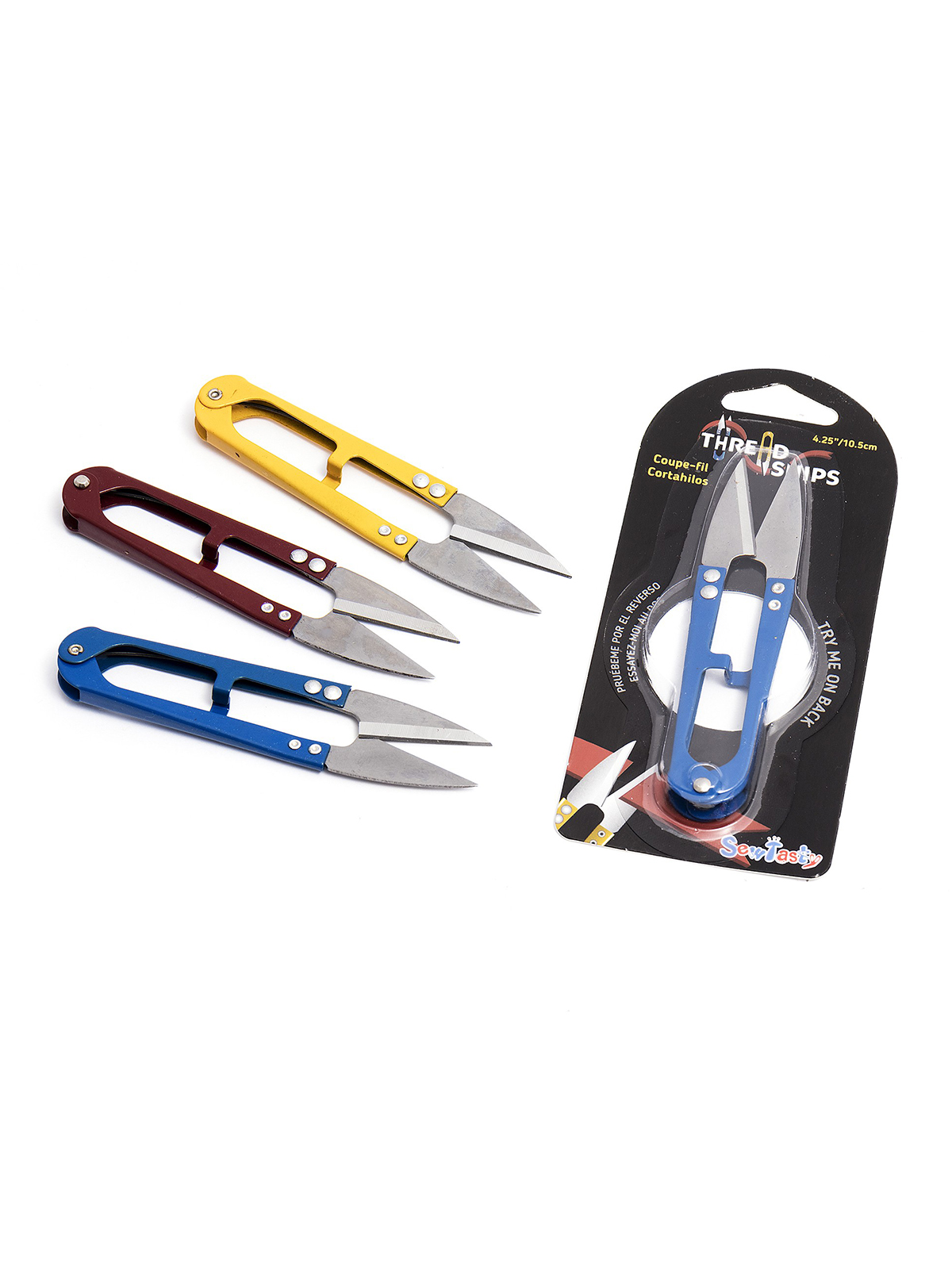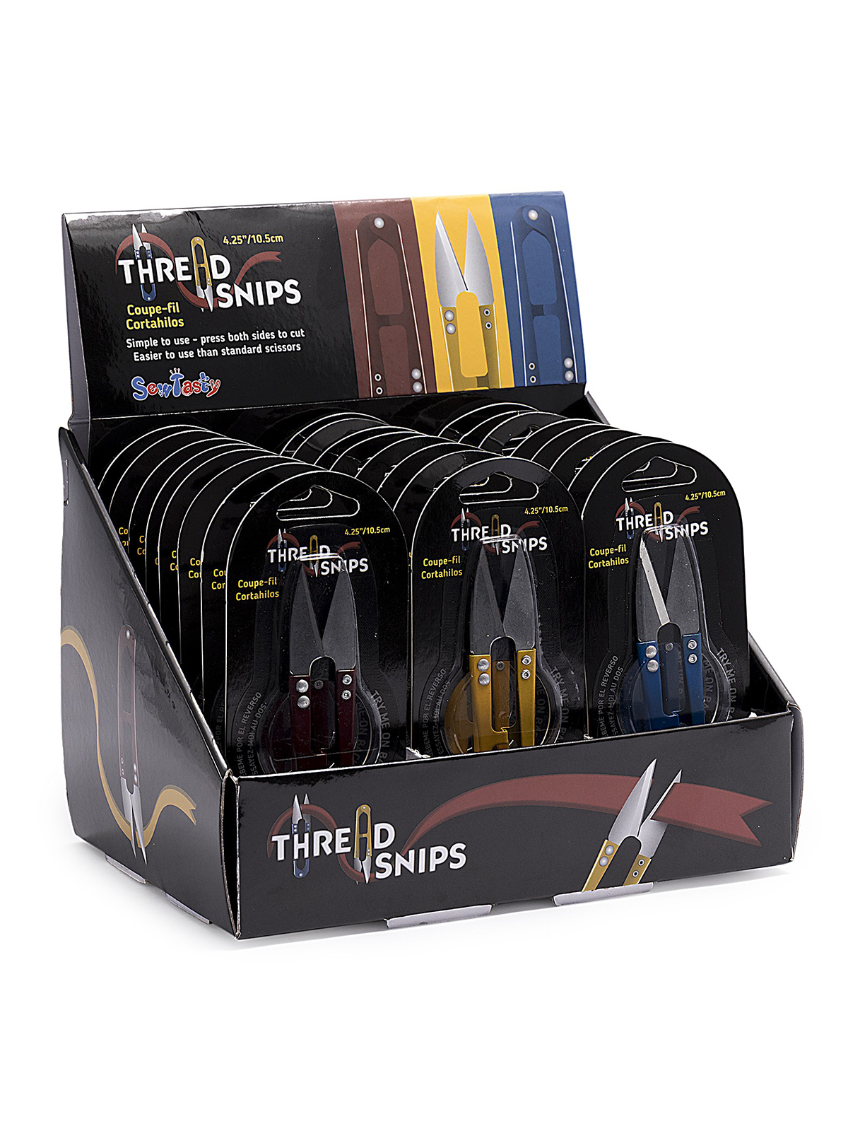 Ножницы-сниппер для обрезки нитей, 10,5 см, в картонном прикассовом стенде. Простые в использовании пружинящие ручки. Качественное нержавеющее стальное лезвие для прочности и точного реза. Цвета: синий/красный/желтый. Размеры изделия: 22 x 15 x 15 см. Общий вес изделия: 850 г.