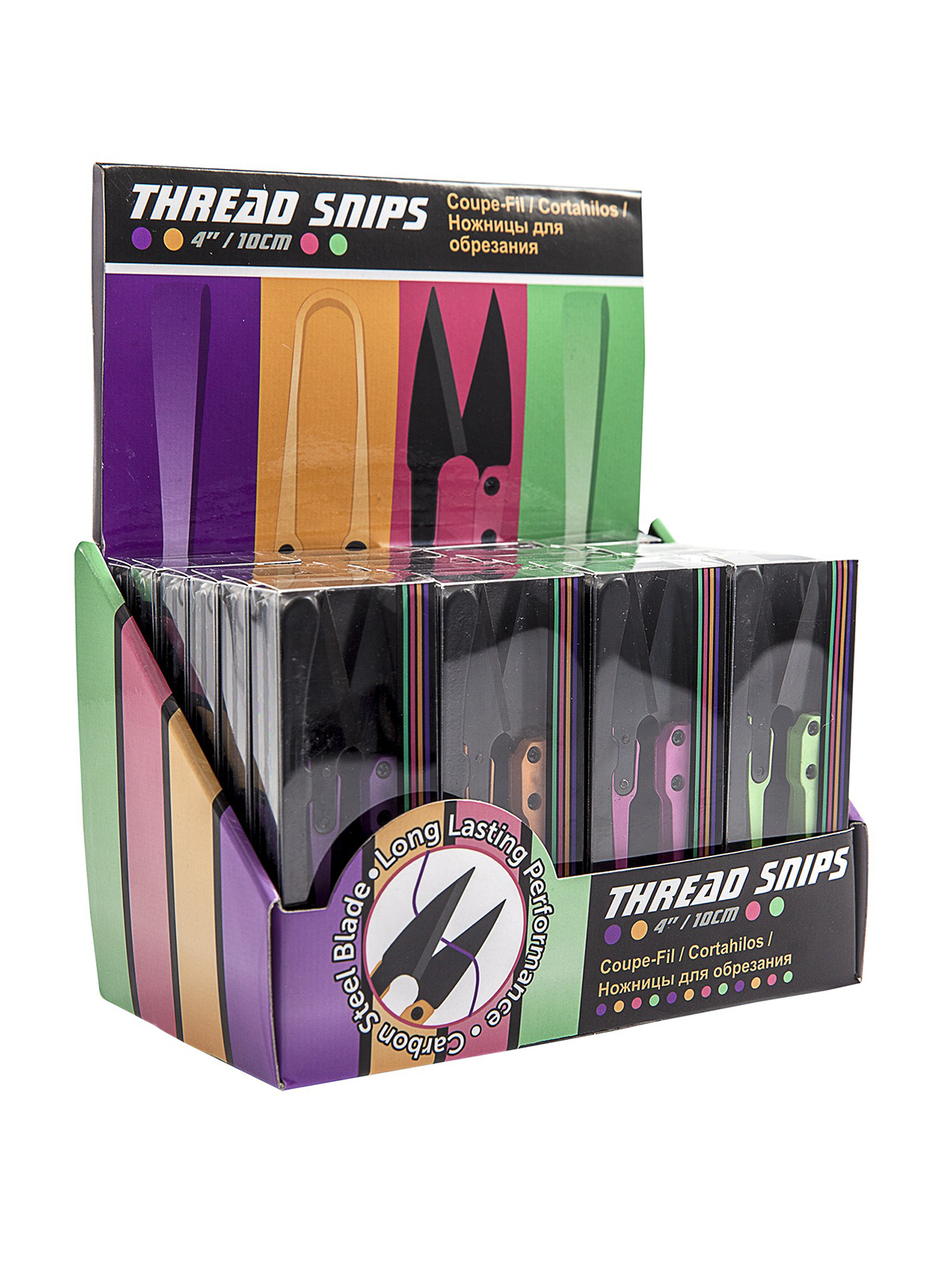 Ножницы-сниппер для обрезки нитей, 10 см, в прикассовом стенде. Лезвия из углеродистой стали повышают эффективность резки. Упрощенный эргономичный дизайн. Упаковано в высококачественную цветную ПЭТ-упаковку. Цвета: лайм, оранжевый, розовый, фиолетовый. Размеры изделия: 9 x 6,5 x 11,5 см. Общий вес изделия: 550 г.