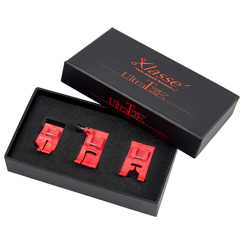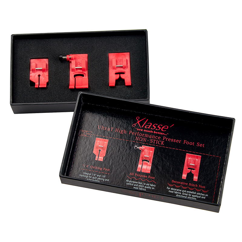 Набор прижимных лапок Klasse соответствует их девизу: «Шить намного лучше». Набор прижимных лапок «Ultra T», состоит из трех самых популярных швейных лапок, отлитых из полимера (антипригарная смола) красного цвета. Лапки имеют привлекательный дизайн и продаются в элегантной подарочной черной коробке. Благодаря гладкой поверхности, лапки легко скользят по плотным и натуральным поверхностям. Прижимные лапки «Ultra T» позволяют швее создавать равномерные и точные швы практически на всех видах тканей и материалах, таких как кожа, замша, эко-кожа, искусственная кожа, винил, пластик, пленка, лайкра и других, которые могут прилипать к обычной прижимной лапке во время шитья.