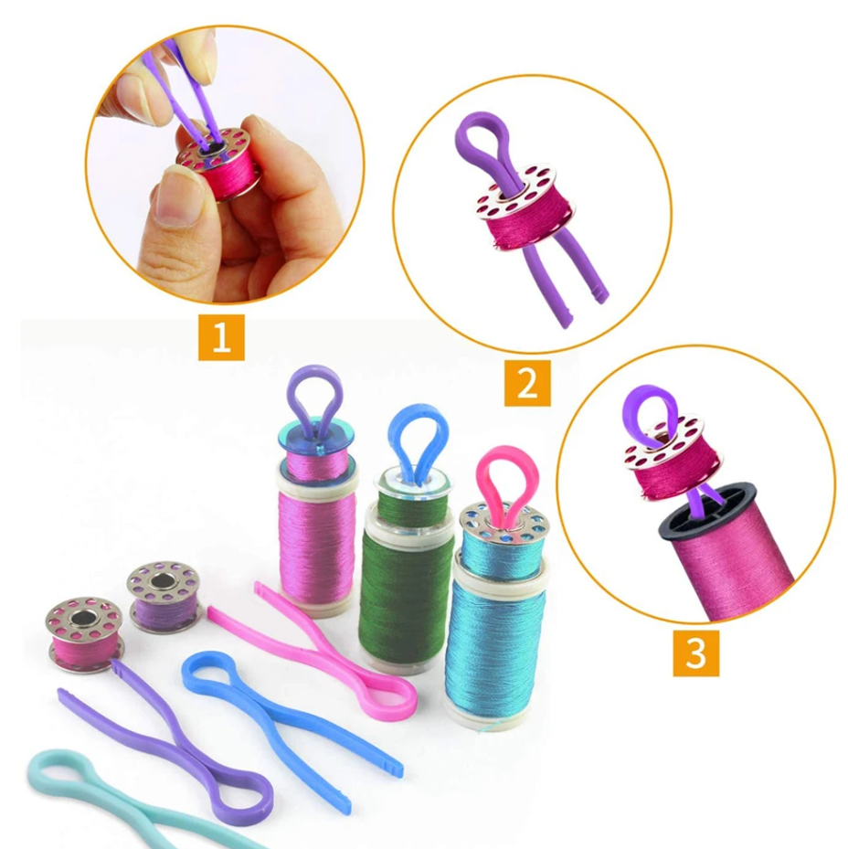 Подходит для всех машинных шпулей, позволяет экономно расходовать нить с одной катушки. Для этого намотайте на шпульку нить нужного цвета и с помощью держателя закрепите ее на большой катушке. Заправьте машину и шейте как обычно. Удобно использовать этот способ для двойных игл.