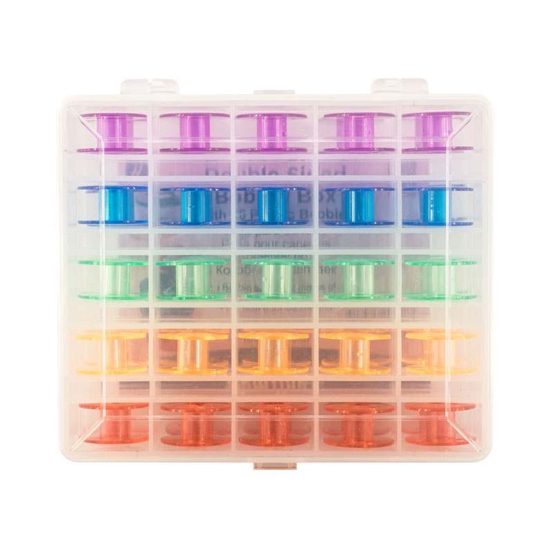 Удобный пластиковый органайзер для машинных шпулек. Наполнен 50 шпулями разных цветов. Шпули подходят большинству швейных машин (как для швейных машин марки Janome/New Home). Органайзер открывается с двух сторон для лучшего доступа к шпулям. Плотное закрытие и надёжные замки.