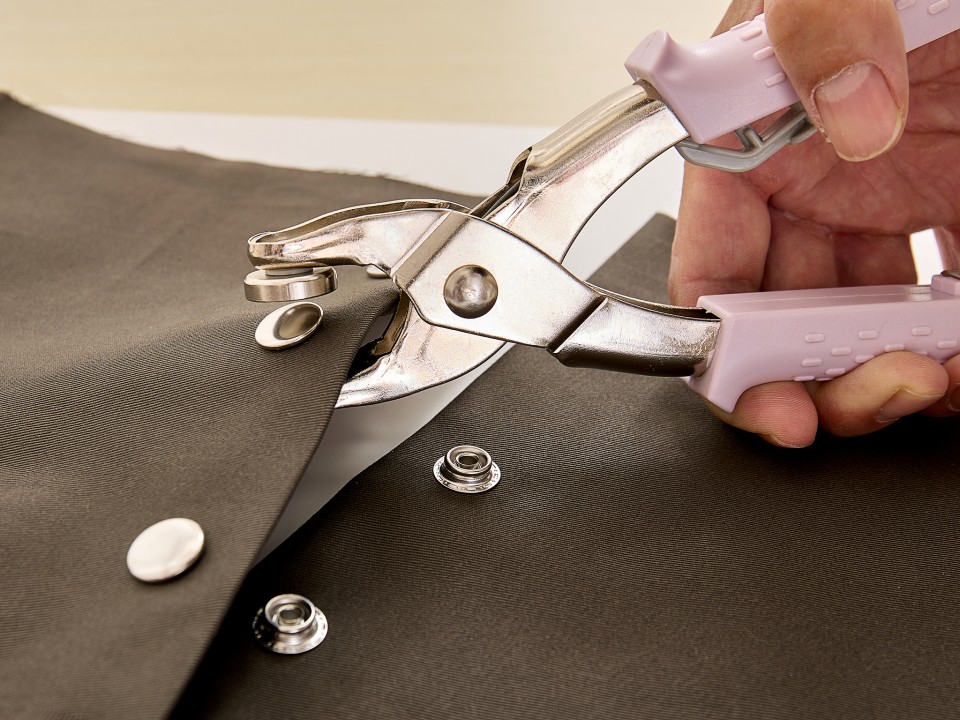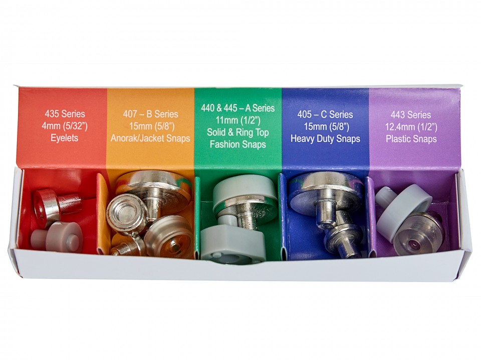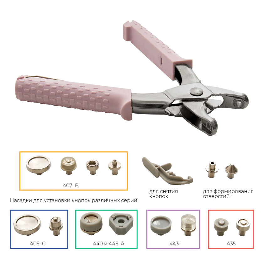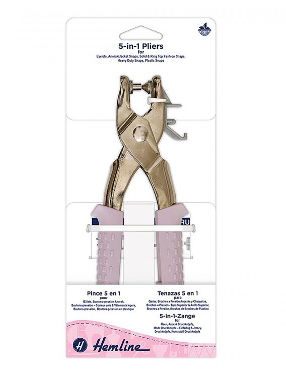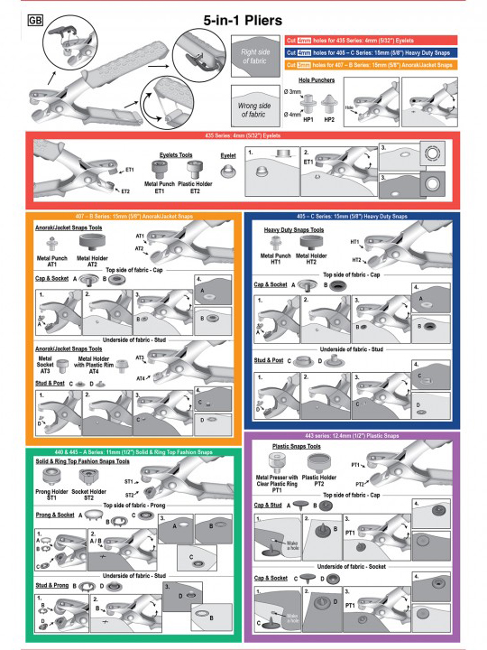 Универсальный стартовый набор «5 в 1» для прочной установки кнопок, люверсов, пластиковых кнопок, кнопок с цельным верхом и кольцом, а также кнопок для анорак/курток. Одна пара плоскогубцев для всего.