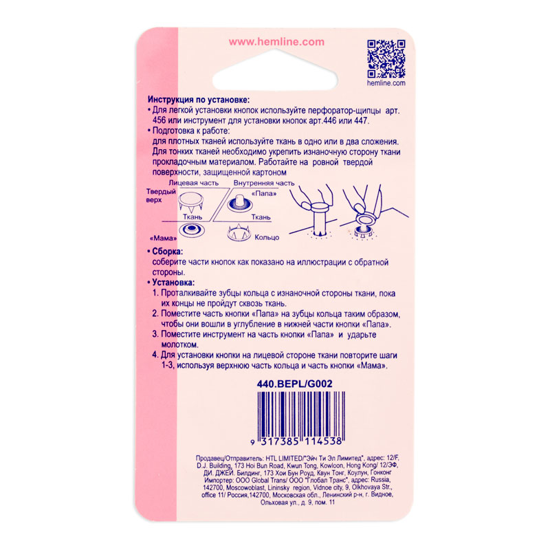 *Для легкой установки кнопок используйте перфоратор-щипцы арт. 456 или инструмент для установки кнопок арт.446 или 447.