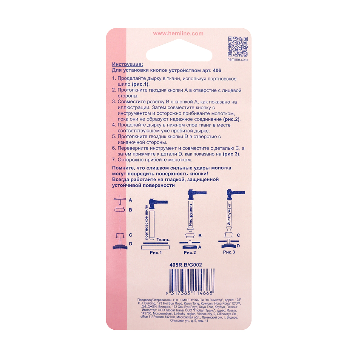 Новое качество премиум! Предназначены для крупных и тяжелых вещей. Для обеспечения толщины между слоями ткани не менее 1-2 мм используйте подкладочную ткань. Внимание! Слишком сильные удары молотка могут повредить поверхность кнопки! Всегда работайте на плоской устойчивой поверхности, защищенной куском картона! Для установки кнопок потребуется инструмент арт. 406.