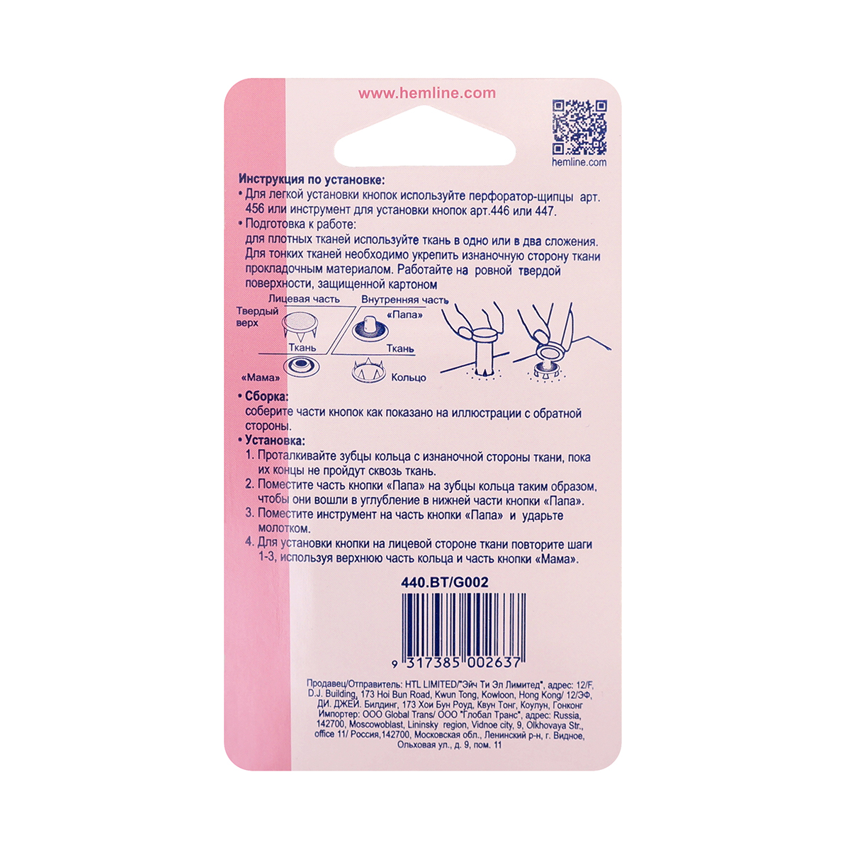 *Для легкой установки кнопок используйте перфоратор-щипцы арт. 456 или инструмент для установки кнопок арт.446 или 447.