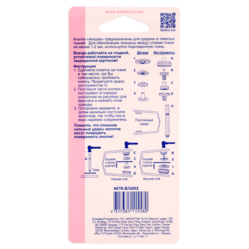 Новое качество премиум! Предназначены для средних и тяжелых вещей. Для обеспечения толщины между слоями ткани не менее 1-2 мм используйте подкладочную ткань. Внимание! Слишком сильные удары молотка могут повредить поверхность кнопки! Всегда работайте на плоской устойчивой поверхности, защищенной куском картона! Для установки кнопок потребуется инструмент арт. 408.NT