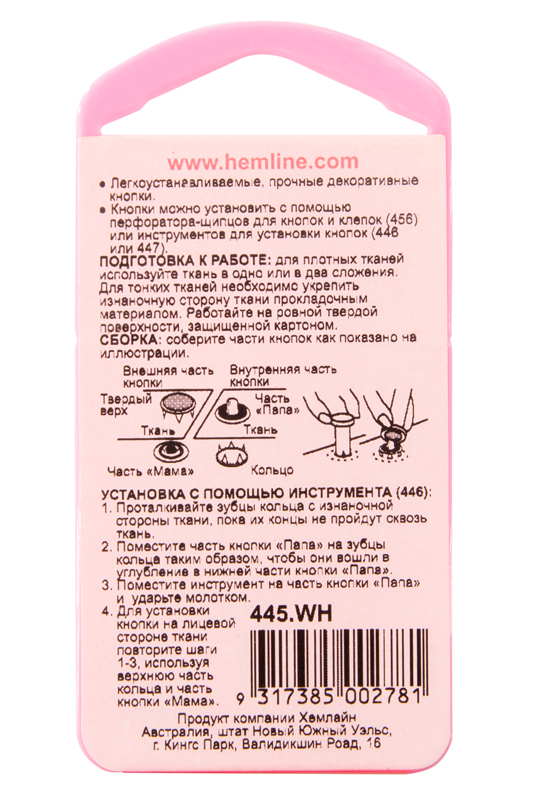*Для легкой установки кнопок используйте перфоратор-щипцы арт. 456 или инструмент для установки кнопок арт.446 или 447.