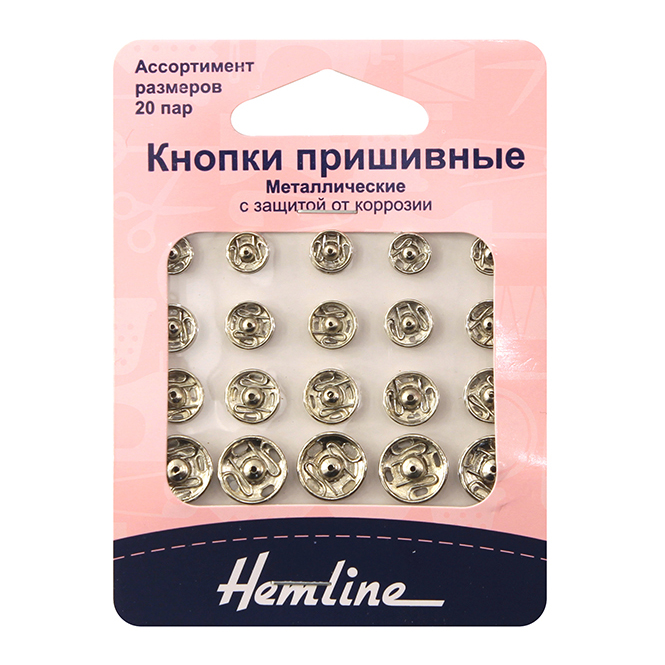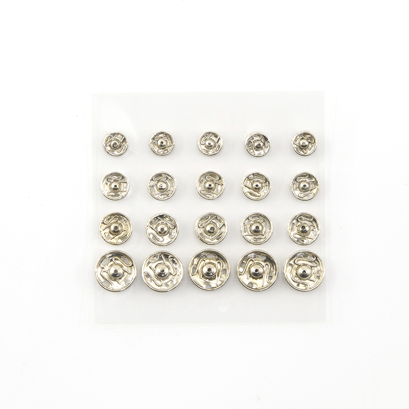 5 пар кнопок в размерах : 6 мм, 7 мм, 9 мм и 11 мм • Центральное отверстие на обеих частях для точного совмещения деталей • Доступны в цветах никель и черный.