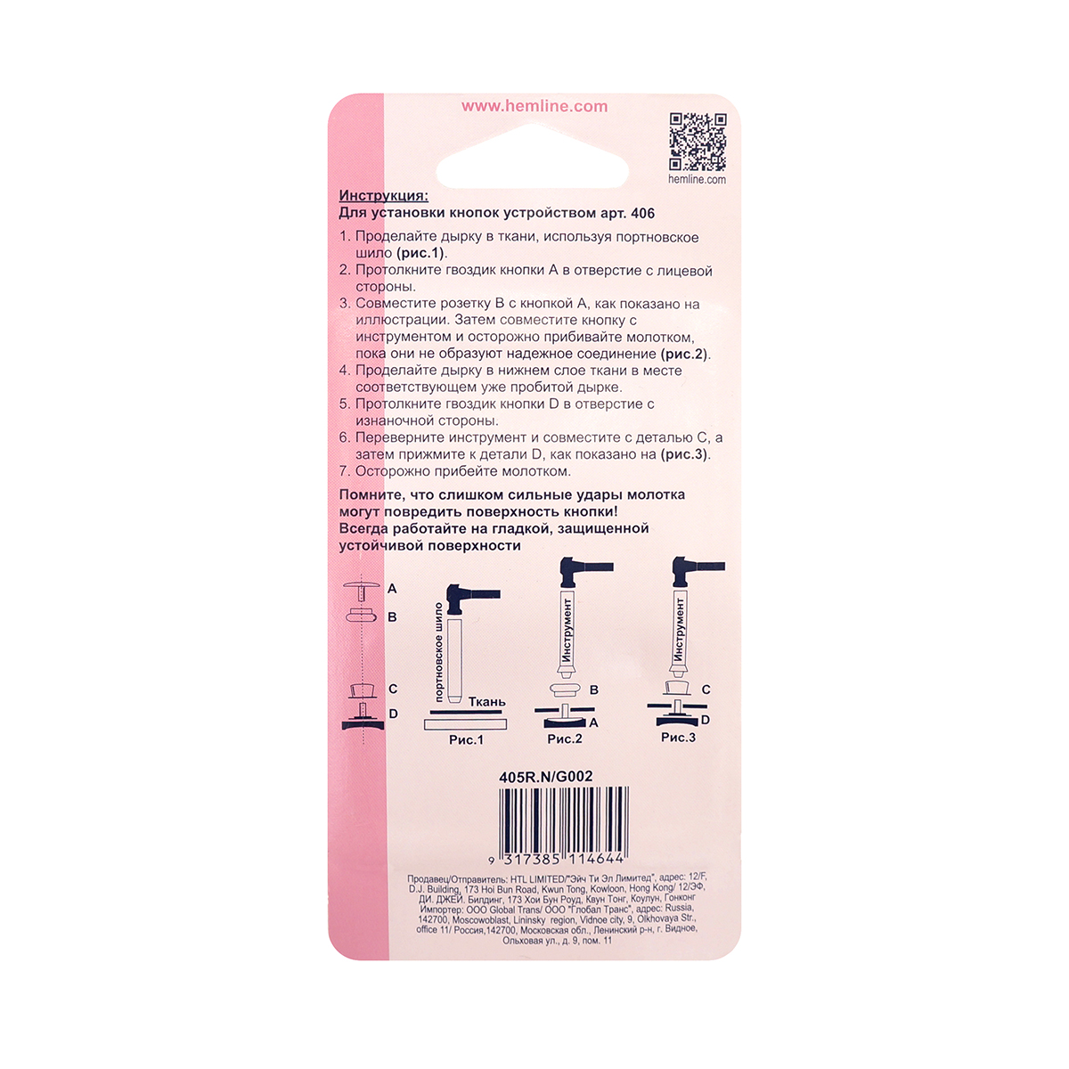 Новое качество премиум!Предназначены для крупных и тяжелых вещей. Для обеспечения толщины между слоями ткани не менее 1-2 мм используйте подкладочную ткань. Внимание! Слишком сильные удары молотка могут повредить поверхность кнопки! Всегда работайте на плоской устойчивой поверхности, защищенной куском картона! Для установки кнопок потребуется инструмент арт. 406.
