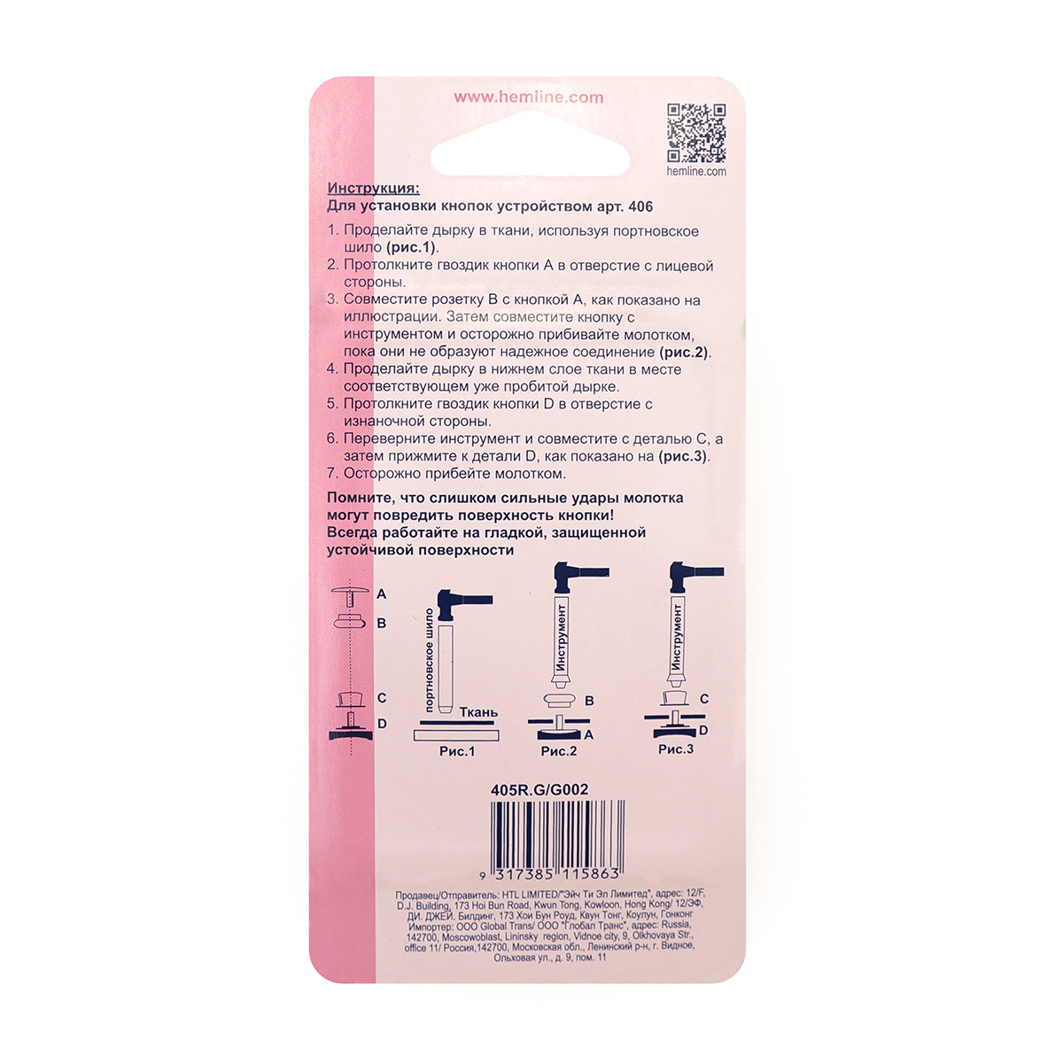 Новое качество премиум!Предназначены для крупных и тяжелых вещей. Для обеспечения толщины между слоями ткани не менее 1-2 мм используйте подкладочную ткань. Внимание! Слишком сильные удары молотка могут повредить поверхность кнопки! Всегда работайте на плоской устойчивой поверхности, защищенной куском картона! Для установки кнопок потребуется инструмент арт. 406.