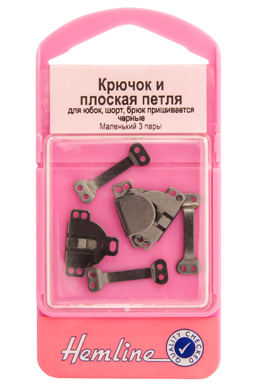Крючки пришивные для брюк, юбок, шорт и легкой одежды (3 пары) - чёрные металлические. Крючок пришивается с изнаночной стороны верхнего края застежки, а плоская петля — с лицевой стороны нижнего края застежки. Крючки и петли пришивают частыми обметочными или петельными стежками, не выводя при этом иглу на лицевую сторону. Ширина: 9 мм. Высота: 15 мм.