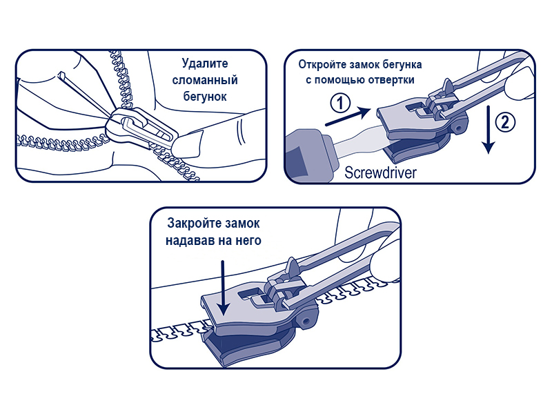 Замените сломанный бегунок на молнии, закрепив бегунок на зубьях молнии.