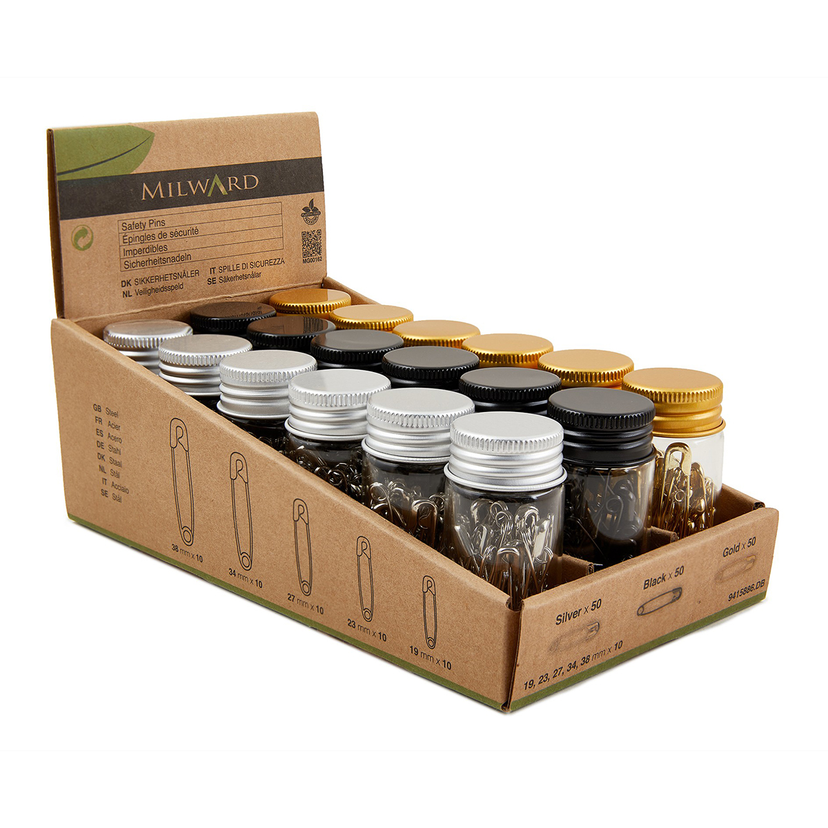 Английские булавки из углеродистой стали черного, золотого и серебряного цвета. Английские булавки разных размеров: 19, 23, 27, 34, 38 мм x 10 шт., 50 шт. в банке. Каждая стеклянная банка с металлической крышкой соответствующего цвета. Штрих-код на каждой стеклянной банке Цвета: черный, золотой и серебряный. Материал содержимого: металл из углеродистой стали. Размеры стеклянной банки: диаметр 2,8 см, высота 6 см. Размеры дисплея (в закрытом виде): Ш11 x Г19 x В6,7 см. Размеры дисплея (сборные): Ш11 x Г19 x В12,5 см. Вес брутто дисплея: 725 г.