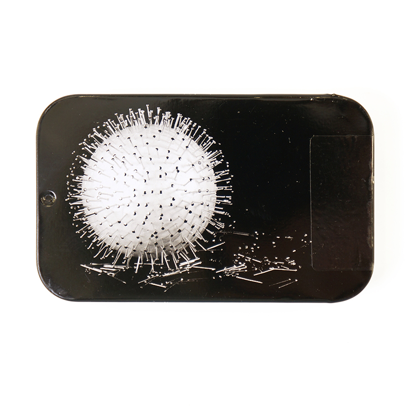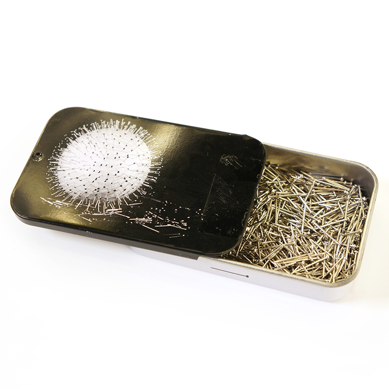 В составе коробочки : булавки-гвоздики 13 мм в количестве около 270 шт. Жестяная коробочка для удобного и безопасного хранения.