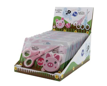Ножницы имеют закруглённые кончики и забавный дизайн. Рекомендуем для детей младшего школьного возраста для изготовления поделок. В набор входят: ножницы с режущей частью 45 мм и сантиметр-рулетка длиной 100 см, розовый цвет- дизайн поросята, голубой цвет - дизайн щенки. Каждый набор в индивидуальном блистере.