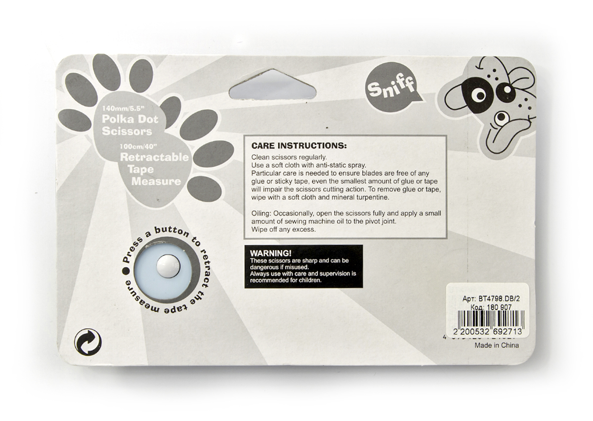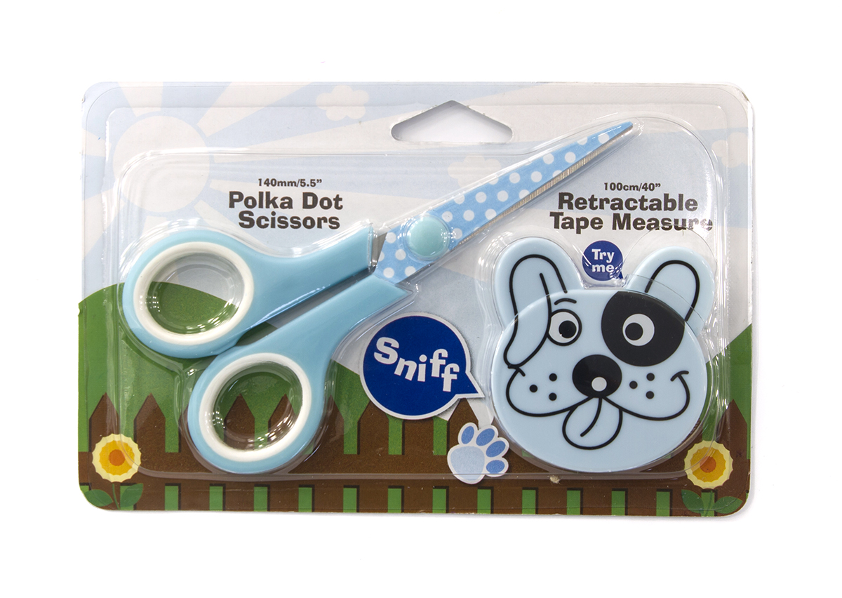 Ножницы имеют закруглённые кончики и забавный дизайн. Рекомендуем для детей младшего школьного возраста для изготовления поделок. В набор входят: ножницы с режущей частью 45 мм и сантиметр-рулетка длиной 100 см, голубой цвет - дизайн щенки. Каждый набор в индивидуальном блистере.
