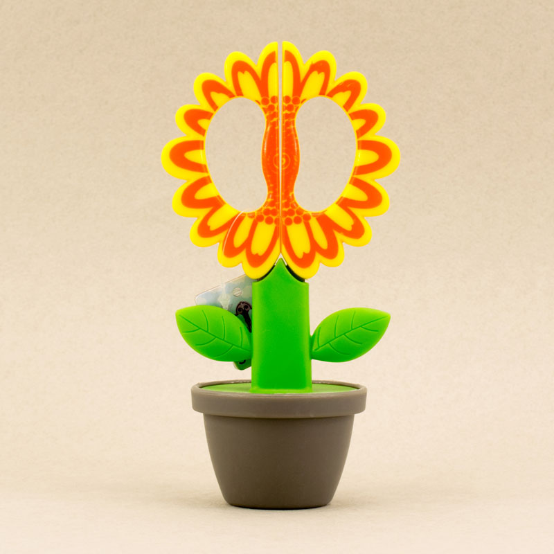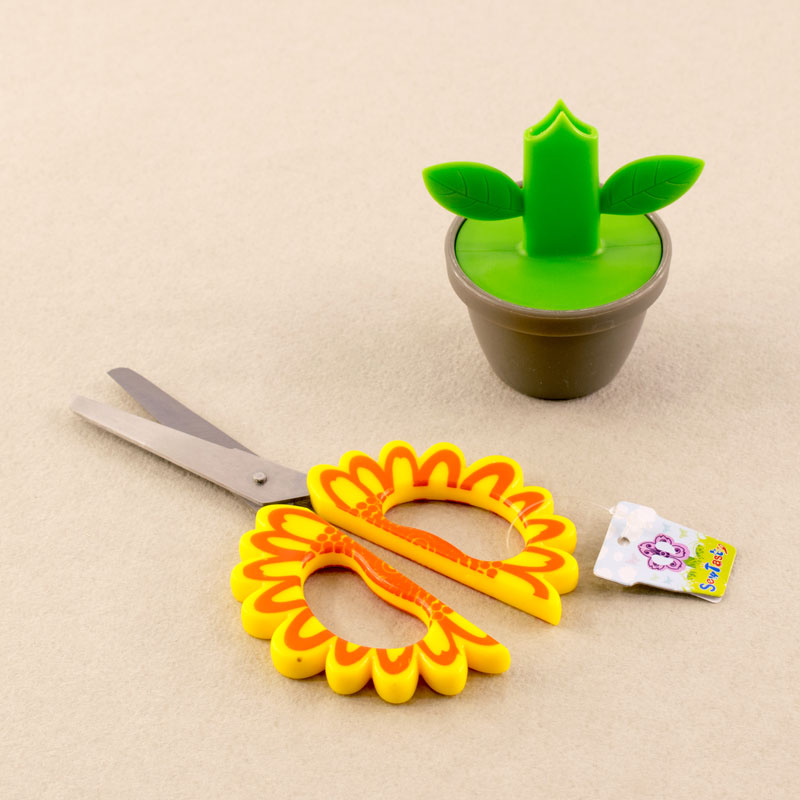 Ножницы имеют закруглённые кончики и забавный дизайн. Рекомендуем для детей младшего школьного возраста для изготовления поделок. Ножницы с режущей частью 50 мм имеют защитный футляр-держатель в виде цветочного горшочка.