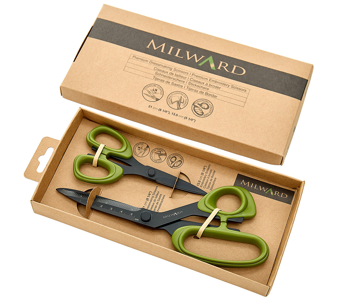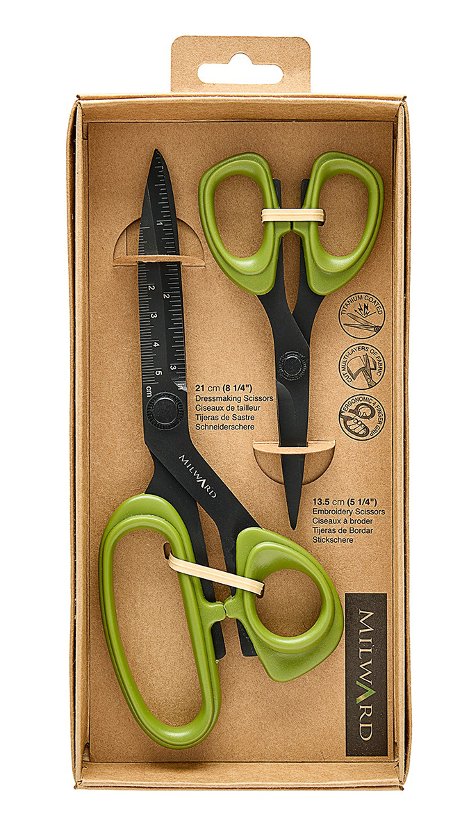 Набор содержит: швейные ножницы премиум-класса 21 см / 8 ¼ дюйма, швейные ножницы премиум-класса 13,5 см / 5 ¼ дюйма. Высококачественные лезвия из нержавеющей стали с титановым покрытием. Прочные и долговечные лезвия для длительной работы. Швейные ножницы разрезают несколько слоев ткани. С разметкой по линейке в сантиметрах и дюймах для точного раскроя (только на портняжных ножницах). Эргономичные ручки удобной посадки. Подарочная коробка из крафт бумаги, пригодная для продажи. Цвета: зеленые ручки, черные лезвия. Материал содержимого: нержавеющая сталь, АБС-пластик. Размеры изделия: 24 x 11,5 x 2,8 см. Вес брутто дисплея: 210 г.