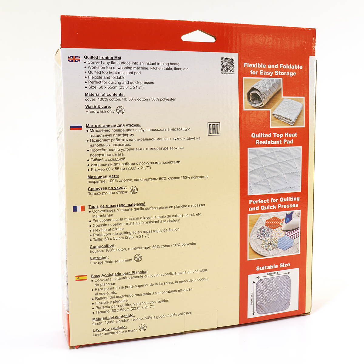 Превратите любую плоскую поверхность в мгновенную гладильную доску. Коврик стеганый для глажения - идеально подходит для стегания и быстрого отжима. Работает на стиральной машине, кухонном столе, полу и т. д. Стеганая верхняя термостойкая прокладка. Гибкая и складная. В многоязыковой картонной коробке hangsell (без пластиковой упаковки). Материал содержимого: подкладка 100% хлопок, наполнитель 50% хлопок и 50% полиэстер. Размер коврика: 60 x 55 см. Размеры изделия: 22 x 26 x 5 см. Вес брутто товара: 275 г.