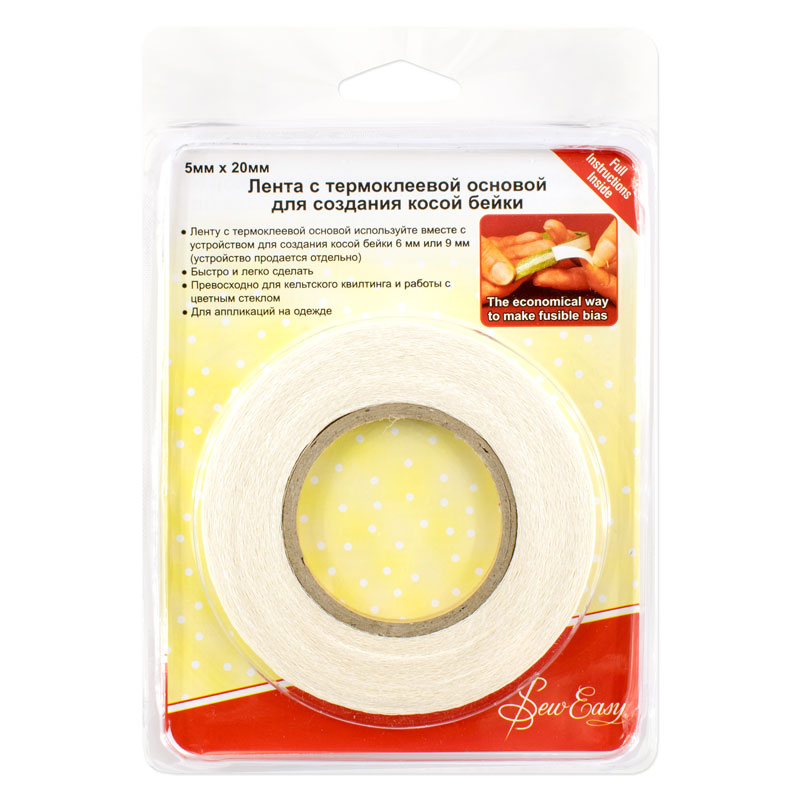 Лента с термоклеевой основой для создания косой бейки Sew Easy идеально подходит для работы с устройством для создания косой бейки и выбранной Вами тканью. Экономный способ создания косой бейки. Ваши работы приобретут аккуратный законченный вид. Легко сочетать оттенки тканей. Превосходно подходит для квилтинга и аппликаций. Для ленты с термоклеевой основой мы рекомендуем использовать устройство для создания косой бейки Sew Easy 6 мм ER518.6 или 9 мм ER518.9.