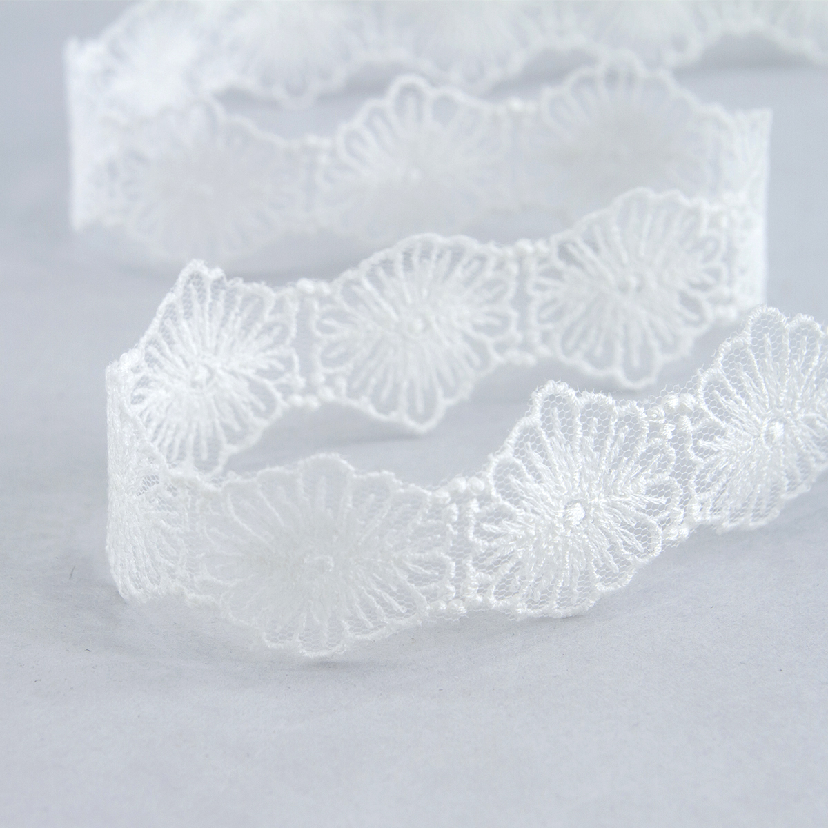 Вышивка выполнена матовыми полиэстеровыми нитями №110. Тюль-основа из 100% полиэстера белого цвета имеет запас на растяжимость, не дает стягивания швов, края не осыпаются. Применяется для отделки свадебных и нарядных женских платьев. Также применяется для отделки женских платьев, юбок и жакетов из легких и средней плотности тканей, например сукна и габардина; великолепно подходит для отделки женского белья и одежды из трикотажа; изысканно смотрится как отделка вязаных изделий. Кружево на тюле мягкое, удобно в носке и легкое в уходе, не мнется. Стирать в режиме деликатной стирки, сушить в расправленном виде, гладить с изнаночной стороны в 1 или 2 температурном режиме.
