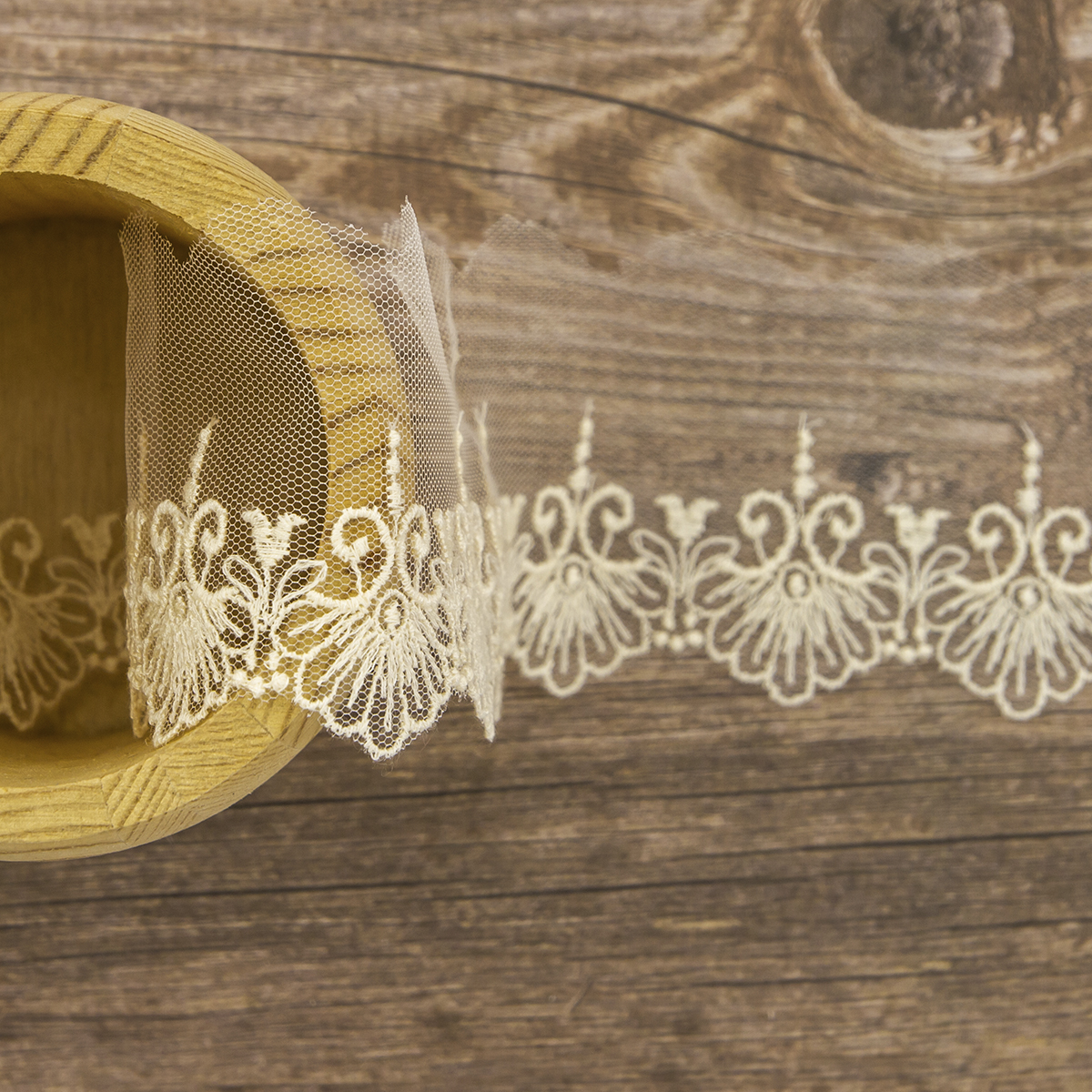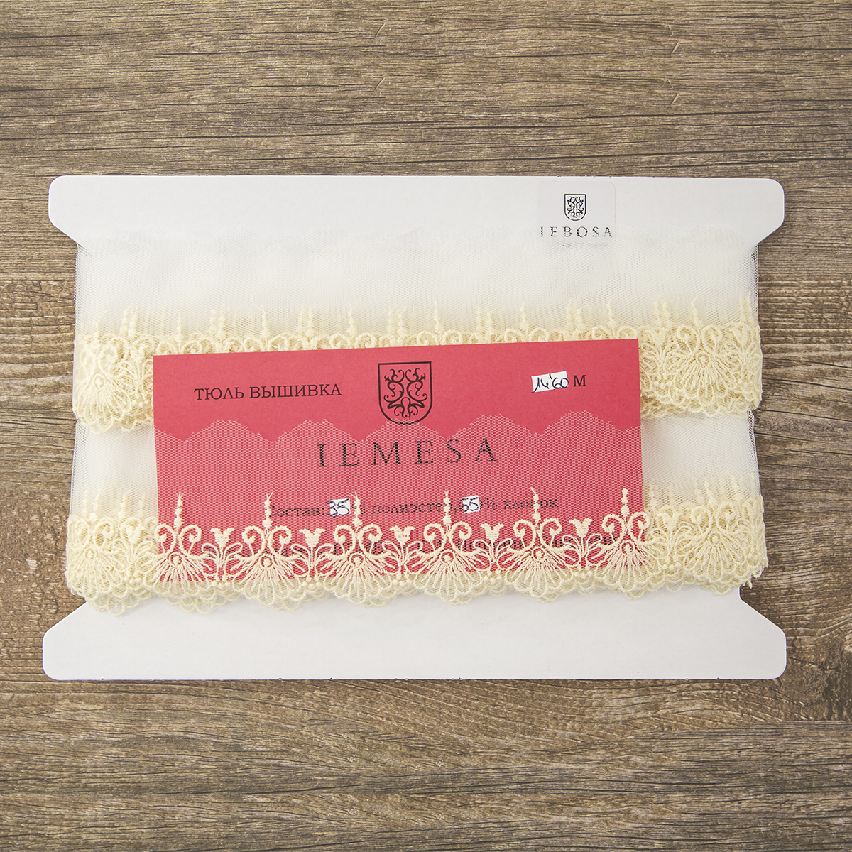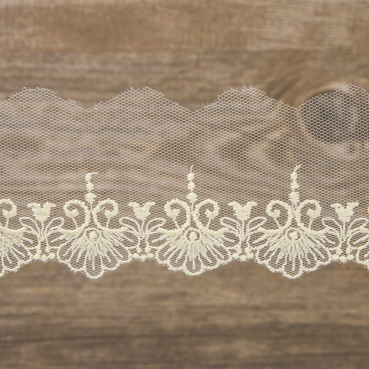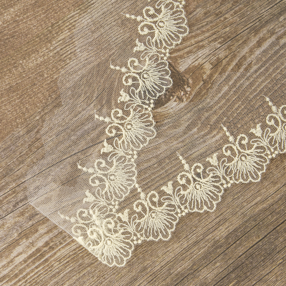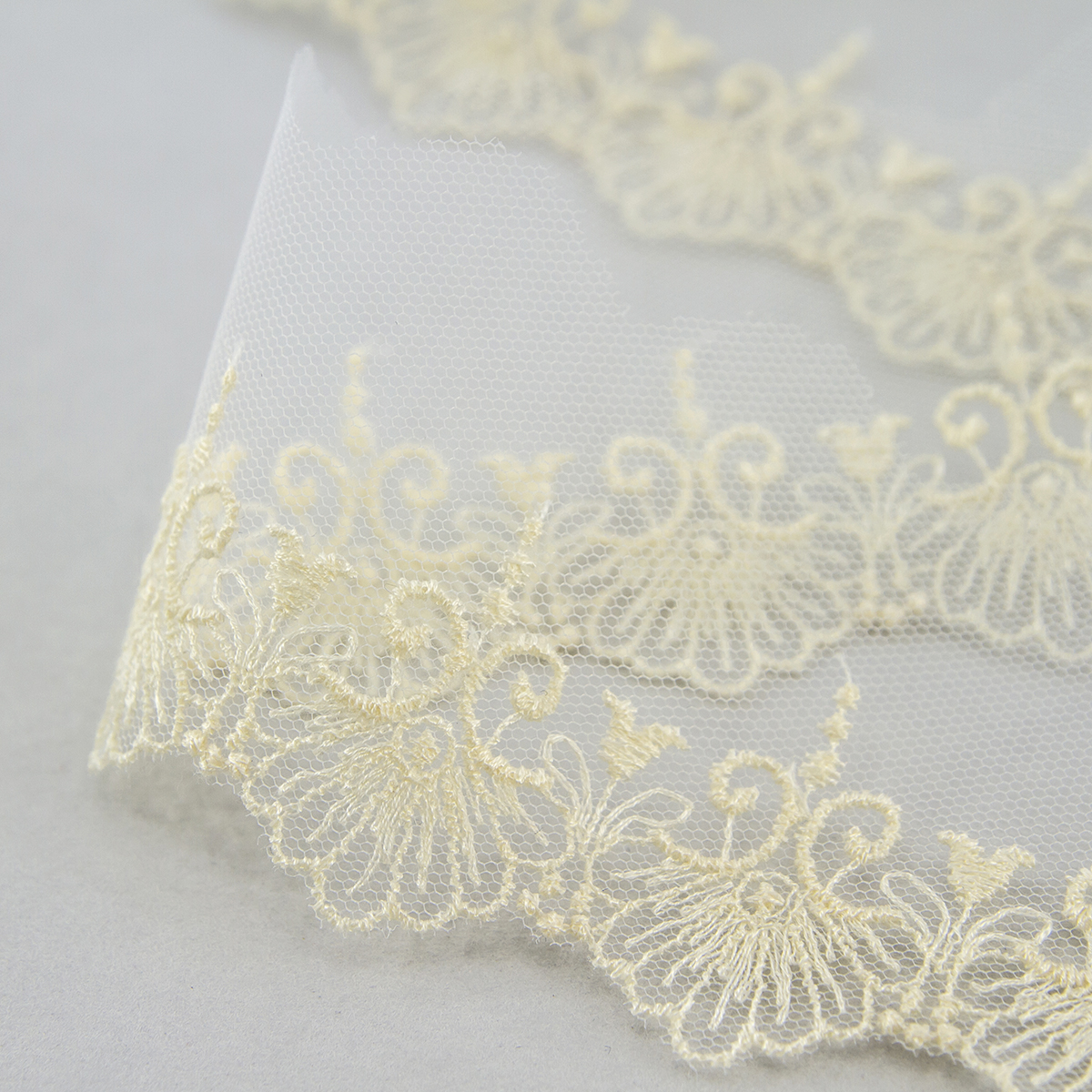 Вышивка выполнена матовыми полиэстеровыми нитями №110. Тюль-основа из 100% полиэстера белого цвета имеет запас на растяжимость, не дает стягивания швов, края не осыпаются. Применяется для отделки свадебных и нарядных женских платьев. Также применяется для отделки женских платьев, юбок и жакетов из легких и средней плотности тканей, например сукна и габардина; великолепно подходит для отделки женского белья и одежды из трикотажа; изысканно смотрится как отделка вязаных изделий. Кружево на тюле мягкое, удобно в носке и легкое в уходе, не мнется. Стирать в режиме деликатной стирки, сушить в расправленном виде, гладить с изнаночной стороны в 1 или 2 температурном режиме.