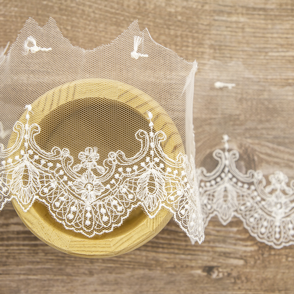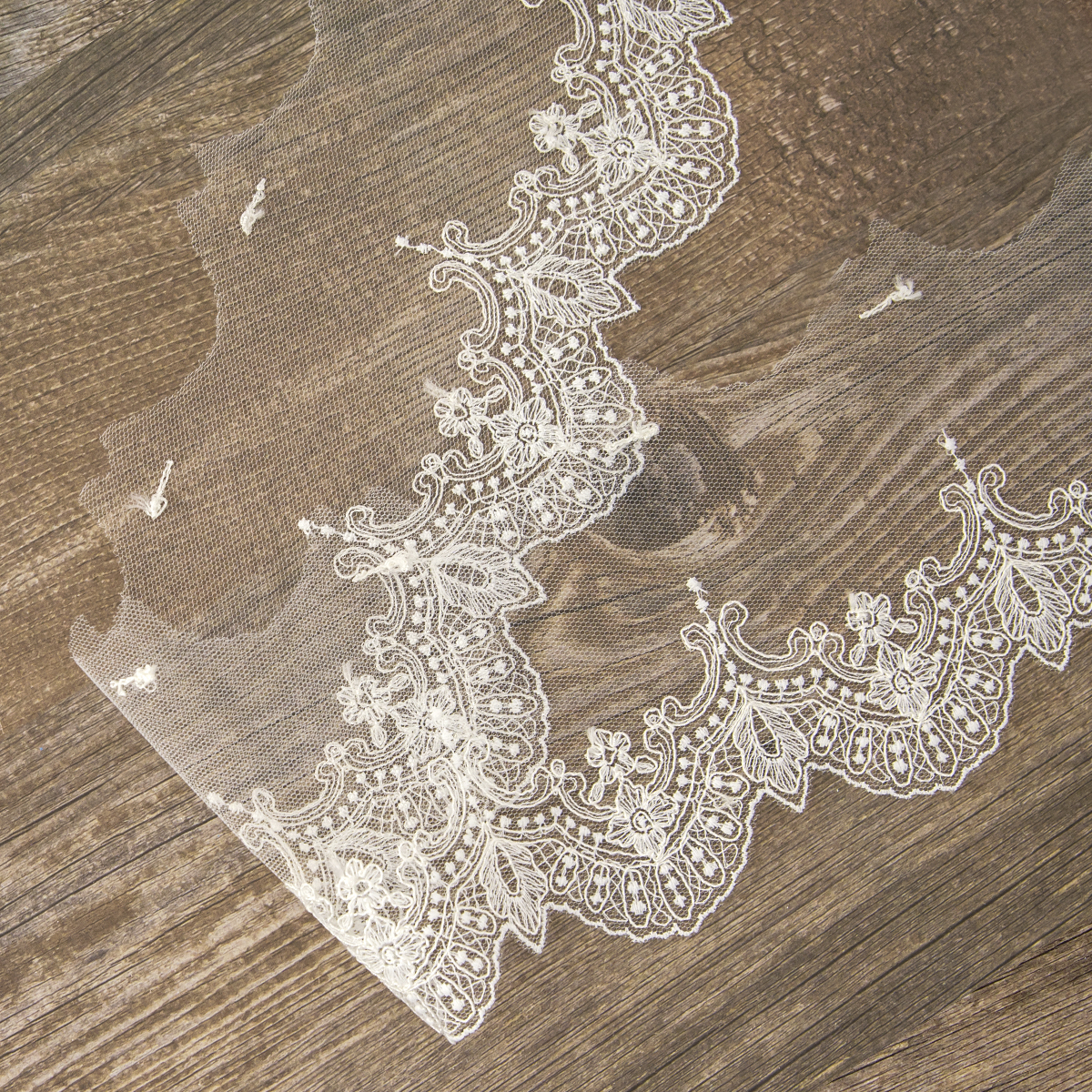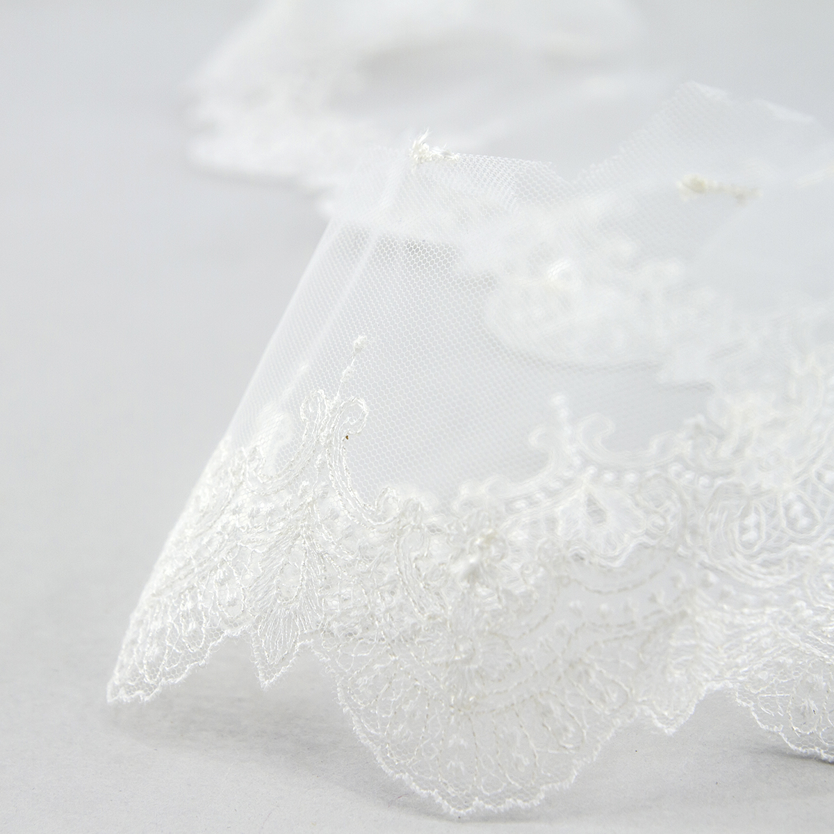 Вышивка выполнена матовыми полиэстеровыми нитями №110. Тюль-основа из 100% полиэстера белого цвета имеет запас на растяжимость, не дает стягивания швов, края не осыпаются. Применяется для отделки свадебных и нарядных женских платьев. Также применяется для отделки женских платьев, юбок и жакетов из легких и средней плотности тканей, например сукна и габардина; великолепно подходит для отделки женского белья и одежды из трикотажа; изысканно смотрится как отделка вязаных изделий. Кружево на тюле мягкое,  удобно в носке и легкое в уходе, не мнется. Стирать в режиме деликатной стирки, сушить в расправленном виде, гладить с изнаночной стороны в 1 или 2 температурном режиме.