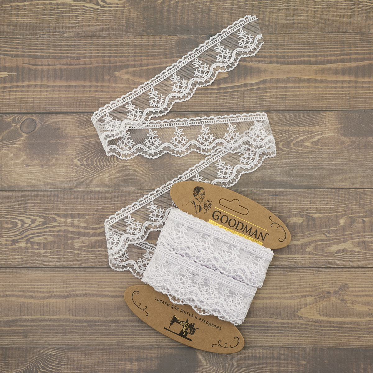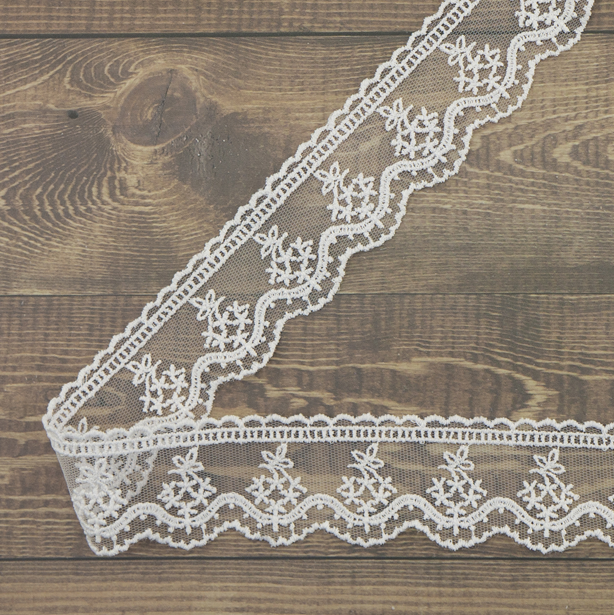 Вышивка выполнена матовыми полиэстеровыми нитями №110. Тюль-основа из 100% полиэстера белого цвета имеет запас на растяжимость, не дает стягивания швов, края не осыпаются. Применяется для отделки свадебных и нарядных женских платьев. Также применяется для отделки женских платьев, юбок и жакетов из легких и средней плотности тканей, например сукна и габардина; великолепно подходит для отделки женского белья и одежды из трикотажа; изысканно смотрится как отделка вязаных изделий. Кружево на тюле мягкое, удобно в носке и легкое в уходе, не мнется. Стирать в режиме деликатной стирки, сушить в расправленном виде, гладить с изнаночной стороны в 1 или 2 температурном режиме.