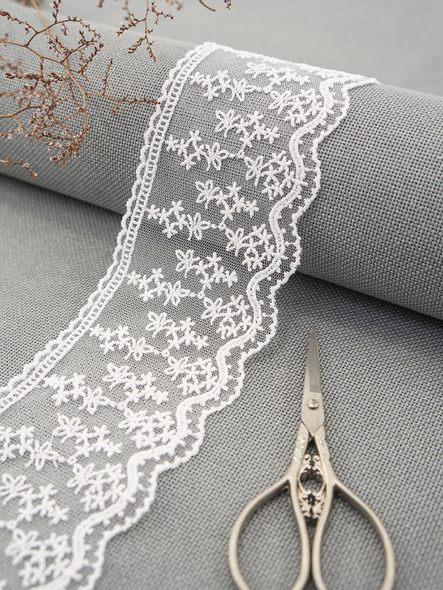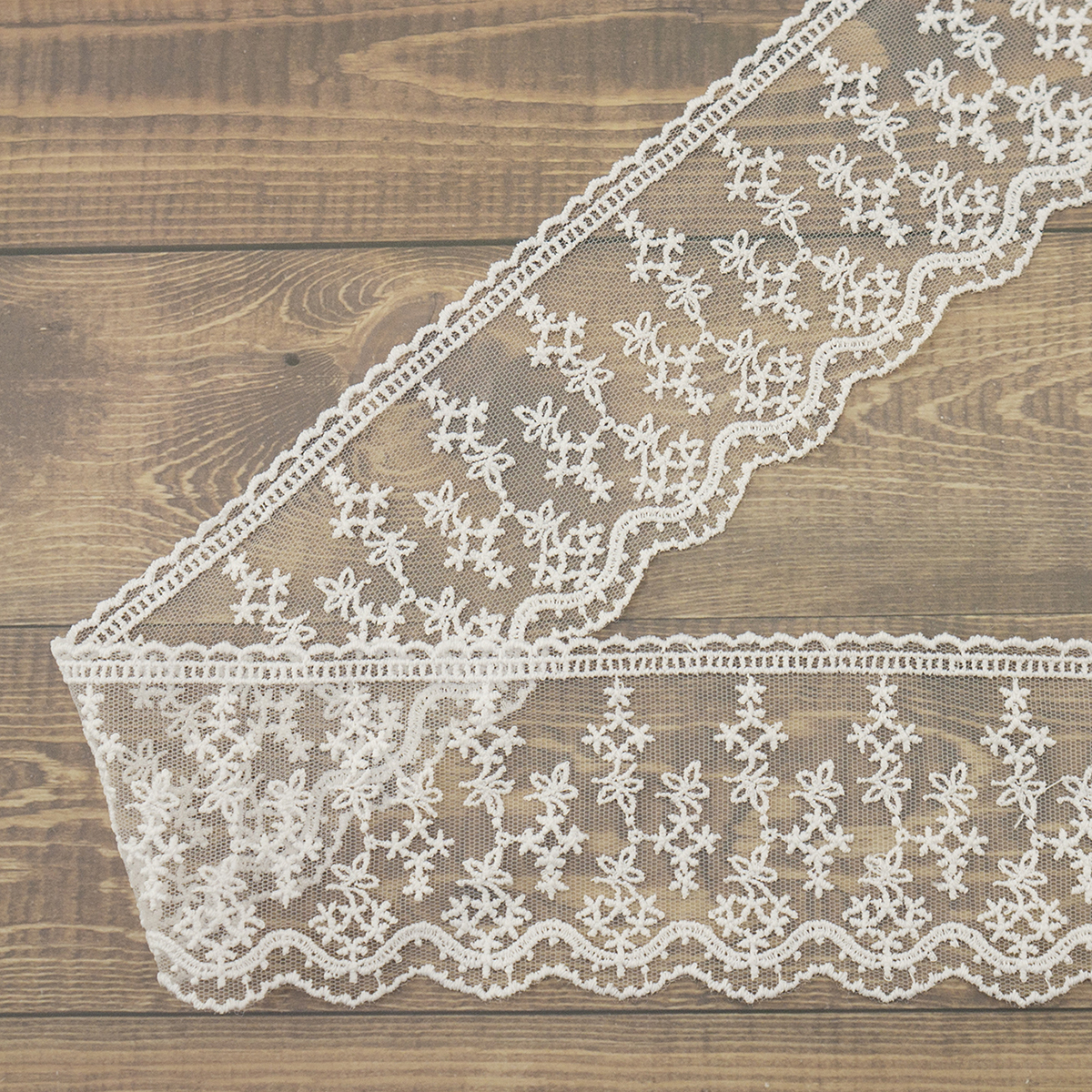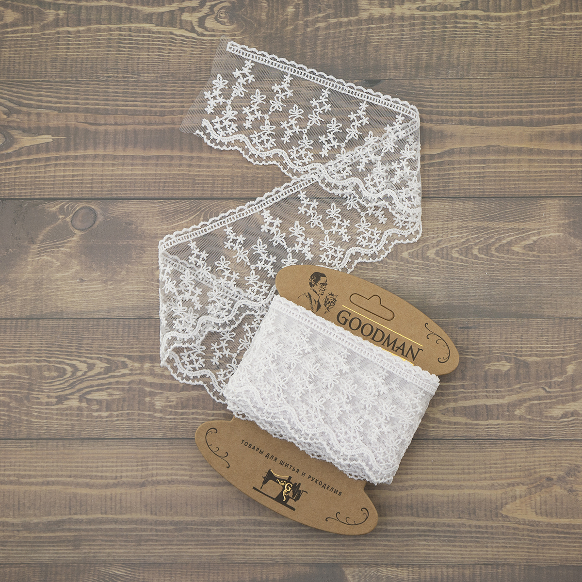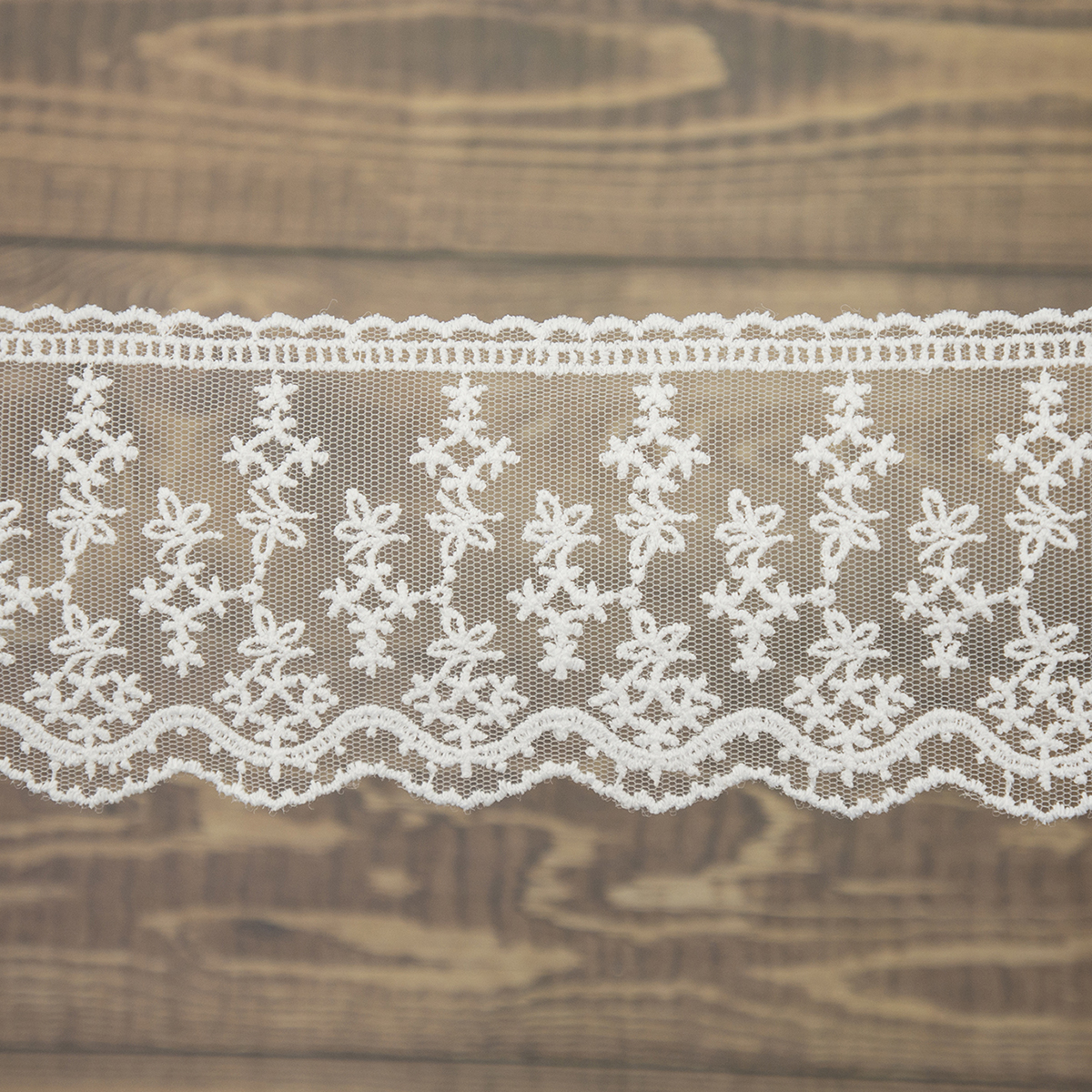 Вышивка выполнена матовыми полиэстеровыми нитями №110. Тюль-основа из 100% полиэстера белого цвета имеет запас на растяжимость, не дает стягивания швов, края не осыпаются. Применяется для отделки свадебных и нарядных женских платьев. Также применяется для отделки женских платьев, юбок и жакетов из легких и средней плотности тканей, например сукна и габардина; великолепно подходит для отделки женского белья и одежды из трикотажа; изысканно смотрится как отделка вязаных изделий. Кружево на тюле мягкое, удобно в носке и легкое в уходе, не мнется. Стирать в режиме деликатной стирки, сушить в расправленном виде, гладить с изнаночной стороны в 1 или 2 температурном режиме.