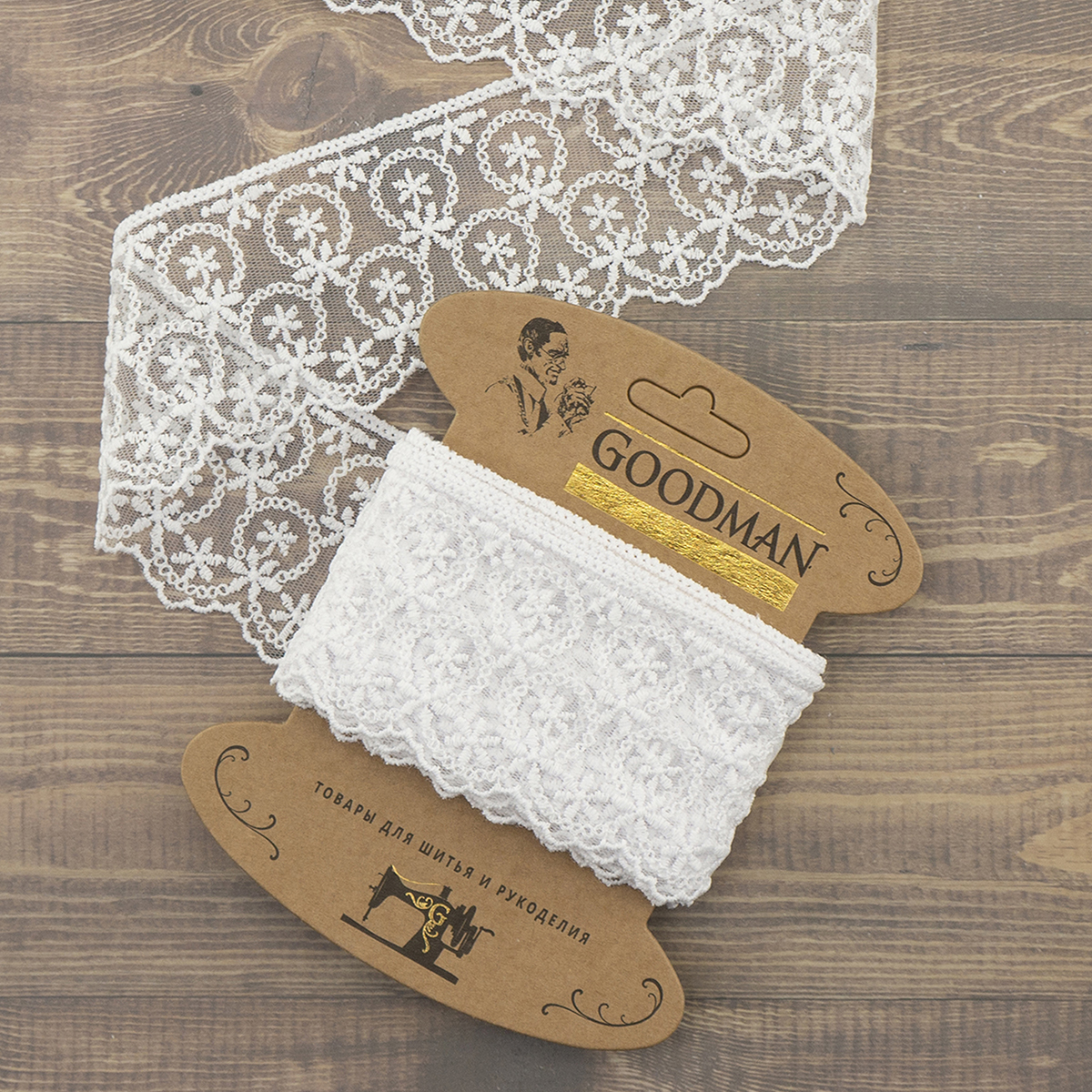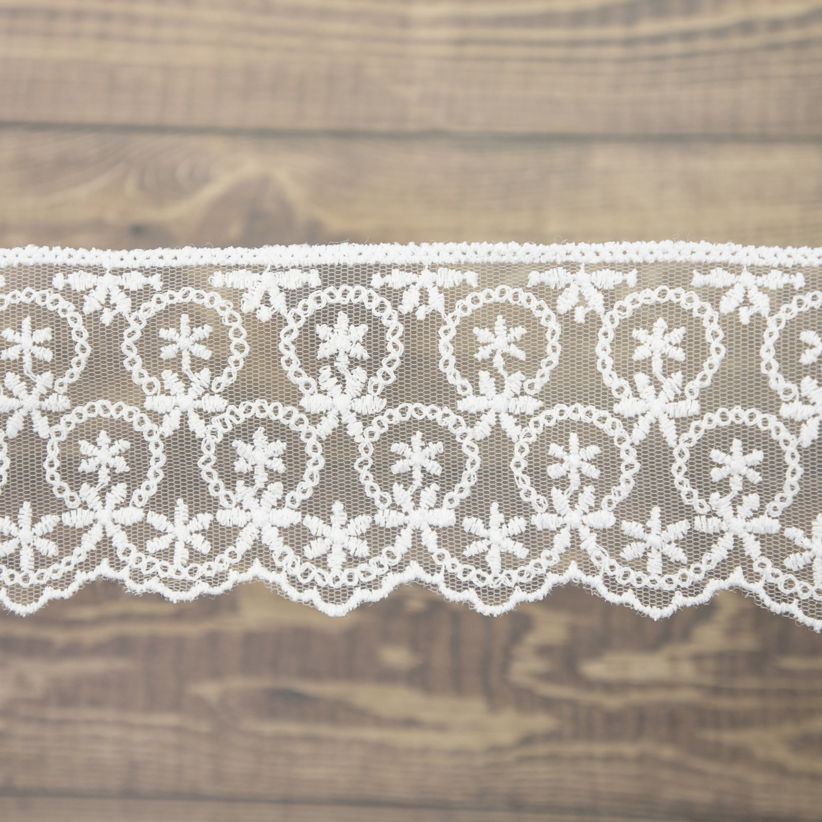 Вышивка выполнена матовыми полиэстеровыми нитями №110. Тюль-основа из 100% полиэстера белого цвета имеет запас на растяжимость, не дает стягивания швов, края не осыпаются. Применяется для отделки свадебных и нарядных женских платьев. Также применяется для отделки женских платьев, юбок и жакетов из легких и средней плотности тканей, например сукна и габардина; великолепно подходит для отделки женского белья и одежды из трикотажа; изысканно смотрится как отделка вязаных изделий. Кружево на тюле мягкое, удобно в носке и легкое в уходе, не мнется. Стирать в режиме деликатной стирки, сушить в расправленном виде, гладить с изнаночной стороны в 1 или 2 температурном режиме.