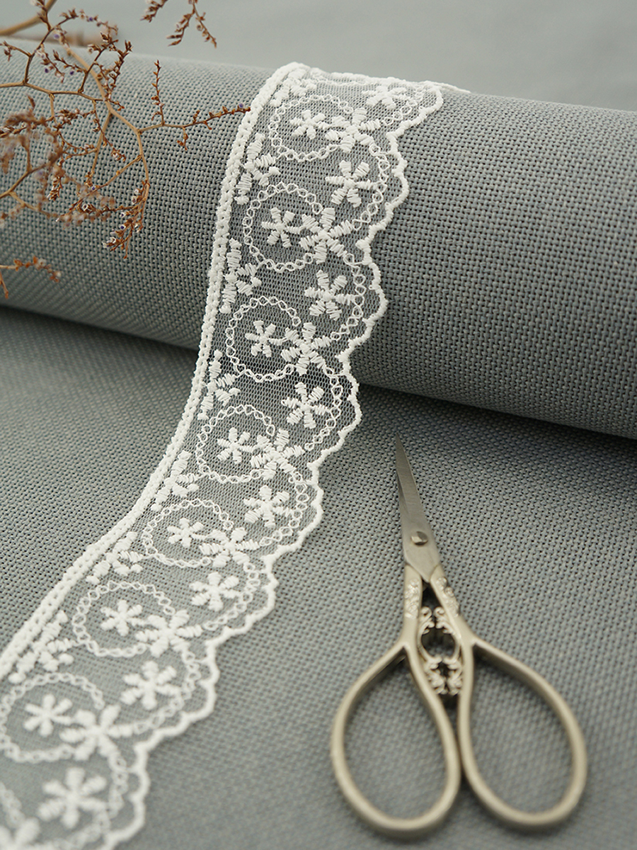 Вышивка выполнена матовыми полиэстеровыми нитями №110. Тюль-основа из 100% полиэстера белого цвета имеет запас на растяжимость, не дает стягивания швов, края не осыпаются. Применяется для отделки свадебных и нарядных женских платьев. Также применяется для отделки женских платьев, юбок и жакетов из легких и средней плотности тканей, например сукна и габардина; великолепно подходит для отделки женского белья и одежды из трикотажа; изысканно смотрится как отделка вязаных изделий. Кружево на тюле мягкое, удобно в носке и легкое в уходе, не мнется. Стирать в режиме деликатной стирки, сушить в расправленном виде, гладить с изнаночной стороны в 1 или 2 температурном режиме.