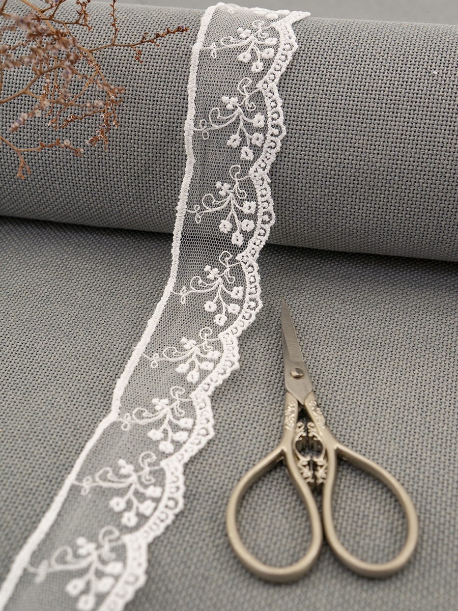 Вышивка выполнена матовыми полиэстеровыми нитями №110. Тюль-основа из 100% полиэстера белого цвета имеет запас на растяжимость, не дает стягивания швов, края не осыпаются. Применяется для отделки свадебных и нарядных женских платьев. Также применяется для отделки женских платьев, юбок и жакетов из легких и средней плотности тканей, например сукна и габардина; великолепно подходит для отделки женского белья и одежды из трикотажа; изысканно смотрится как отделка вязаных изделий. Кружево на тюле мягкое, удобно в носке и легкое в уходе, не мнется. Стирать в режиме деликатной стирки, сушить в расправленном виде, гладить с изнаночной стороны в 1 или 2 температурном режиме.