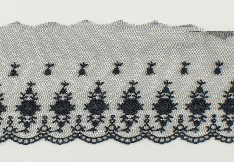 Вышивка выполнена матовыми полиэстеровыми нитями №110. Тюль-основа из 100% полиэстера имеет запас на растяжимость, не дает стягивания швов, края не осыпаются. Применяется для отделки свадебных и нарядных женских платьев. Также применяется для отделки женских платьев, юбок и жакетов из легких и средней плотности тканей, например сукна и габардина; великолепно подходит для отделки женского белья и одежды из трикотажа; изысканно смотрится как отделка вязаных изделий. Кружево на тюле мягкое, удобно в носке и легкое в уходе, не мнется. Стирать в режиме деликатной стирки, сушить в расправленном виде, гладить с изнаночной стороны в 1 или 2 температурном режиме.