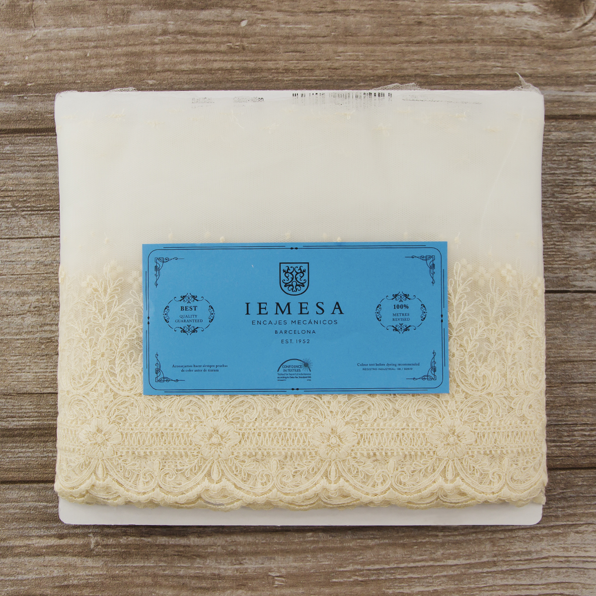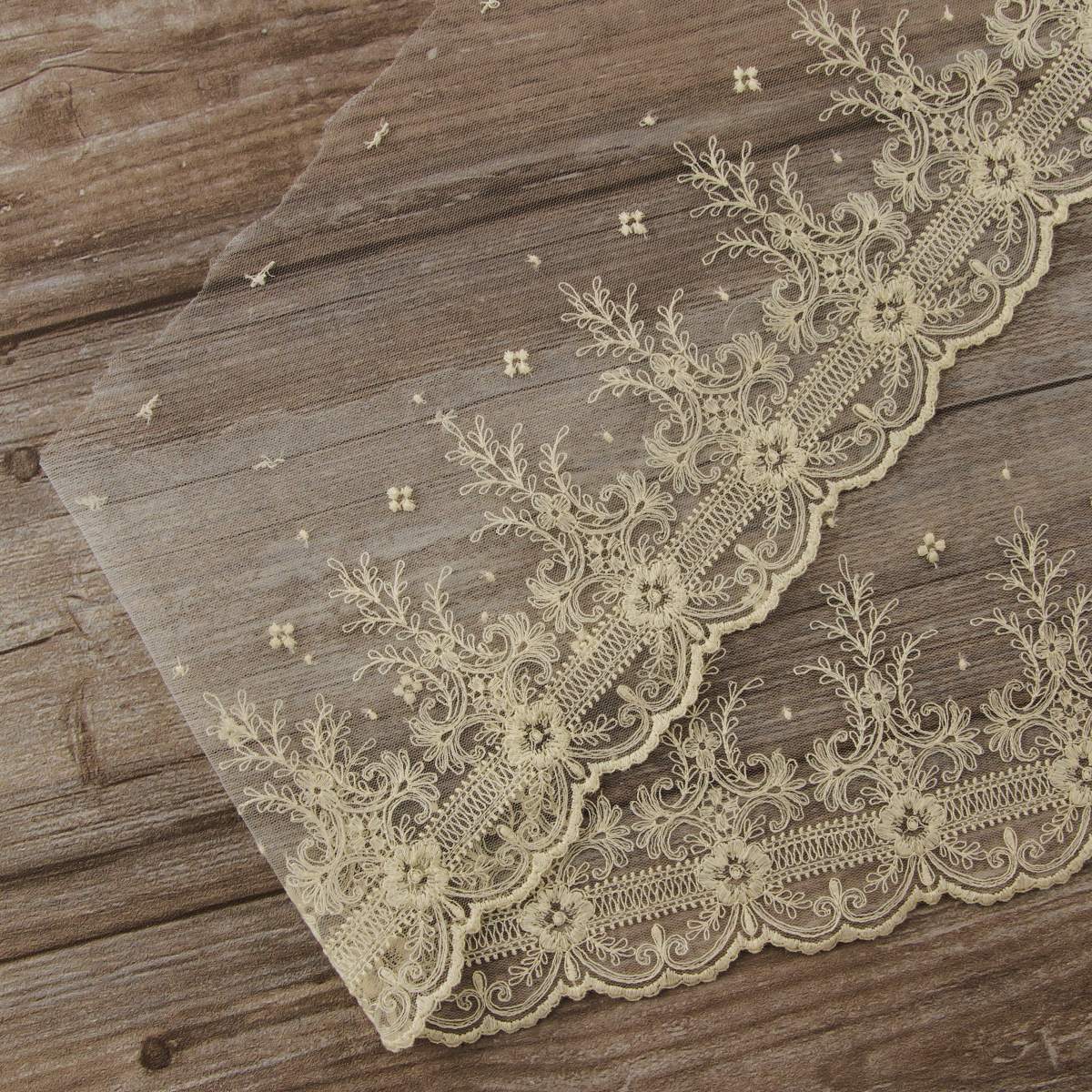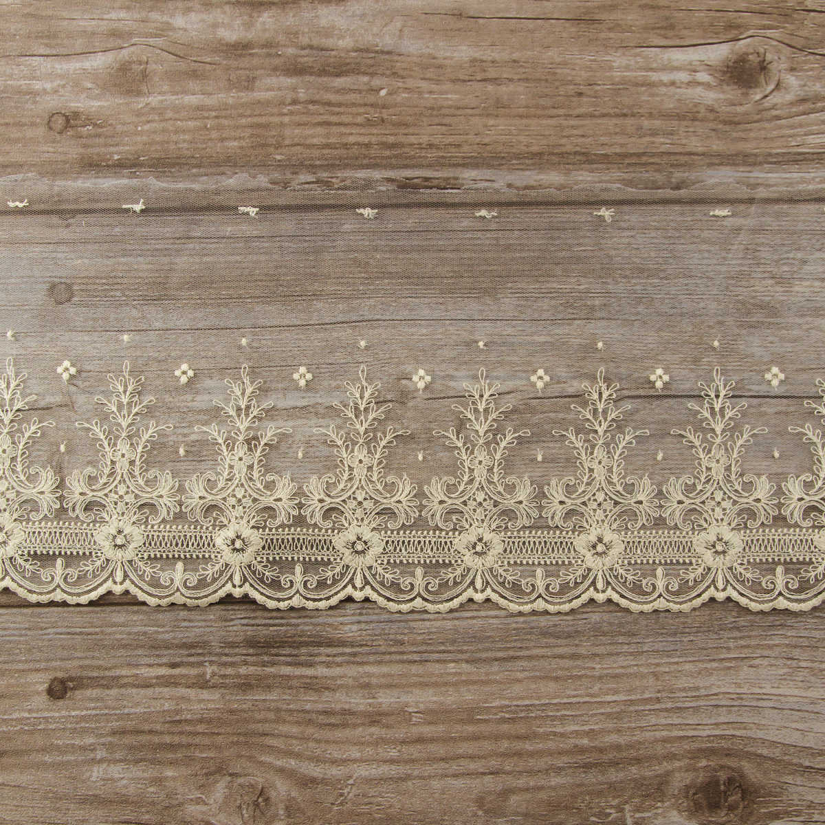 Вышивка выполнена матовыми полиэстеровыми нитями №110. Тюль-основа из 100% полиэстера имеет запас на растяжимость, не дает стягивания швов, края не осыпаются. Применяется для отделки свадебных и нарядных женских платьев. Также применяется для отделки женских платьев, юбок и жакетов из легких и средней плотности тканей, например сукна и габардина; великолепно подходит для отделки женского белья и одежды из трикотажа; изысканно смотрится как отделка вязаных изделий. Кружево на тюле мягкое, удобно в носке и легкое в уходе, не мнется. Стирать в режиме деликатной стирки, сушить в расправленном виде, гладить с изнаночной стороны в 1 или 2 температурном режиме.