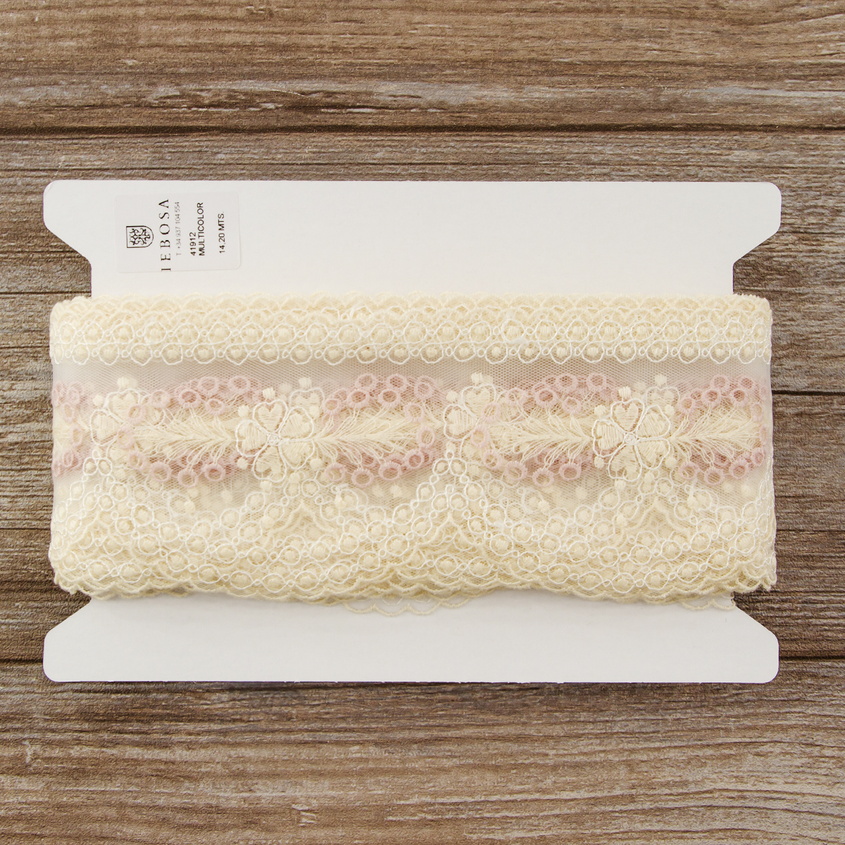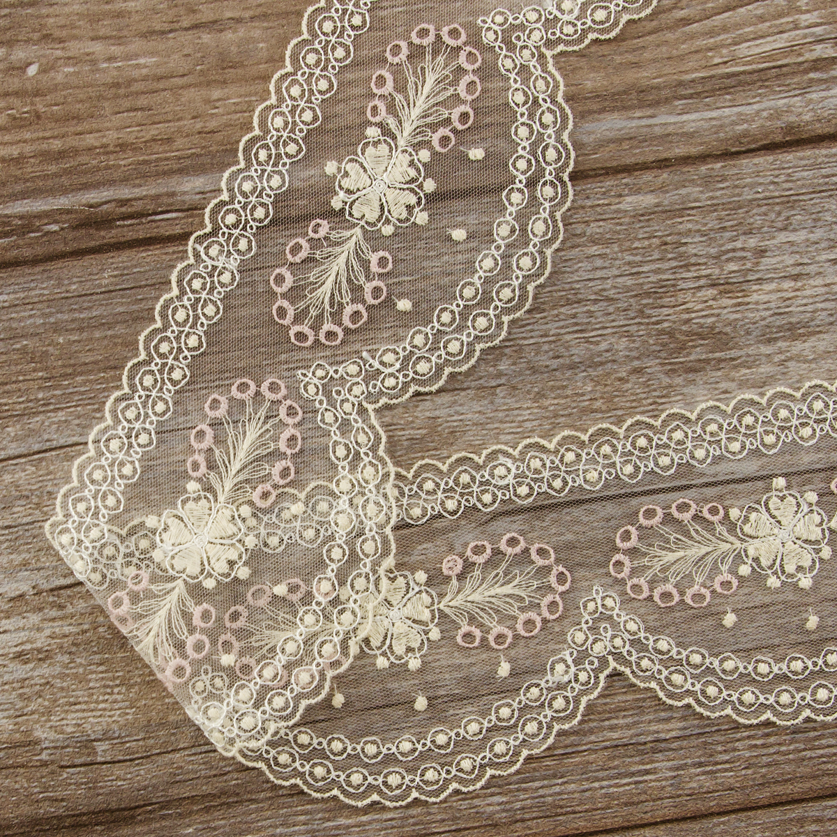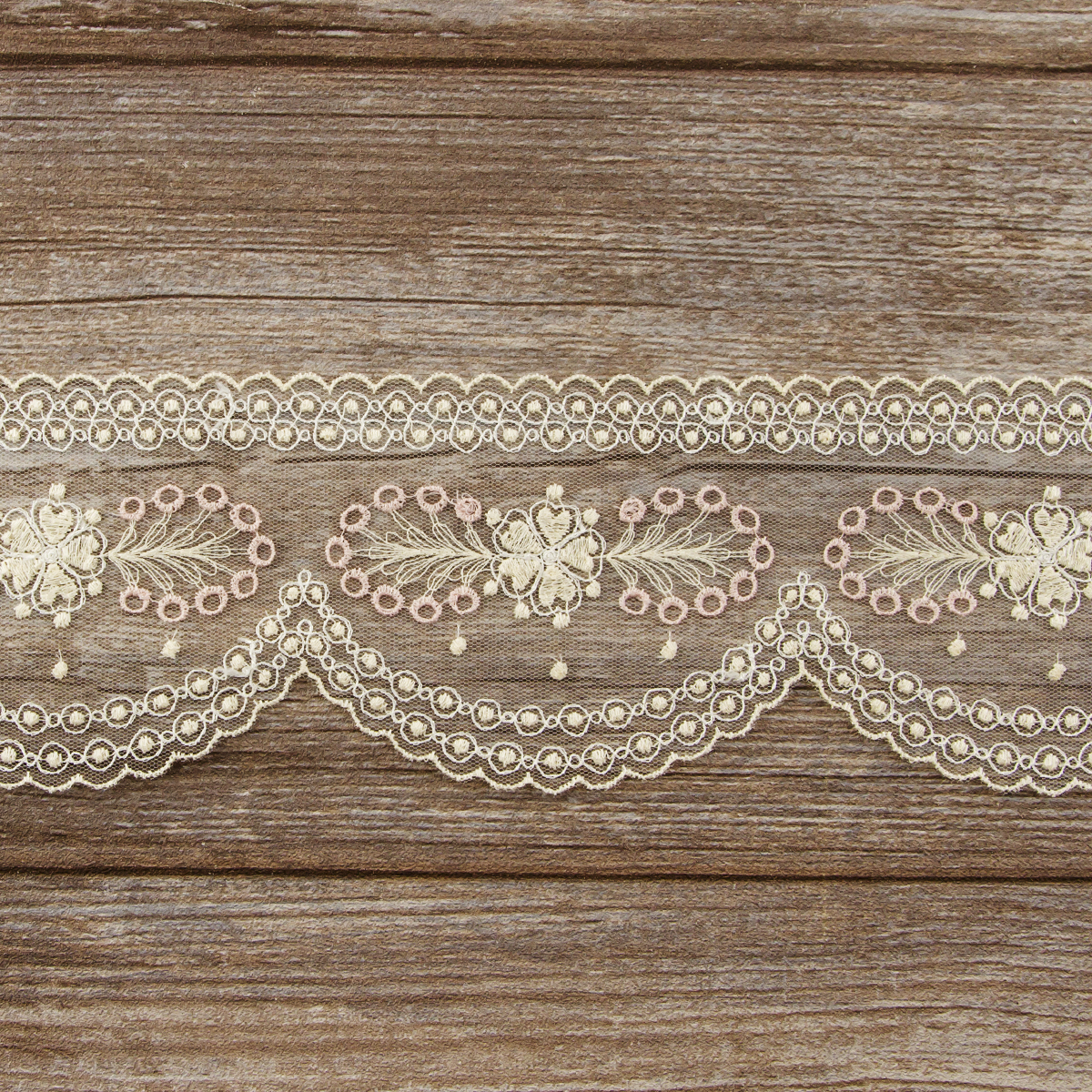Вышивка выполнена матовыми полиэстеровыми нитями №110. Тюль-основа из 100% полиэстера белого цвета имеет запас на растяжимость, не дает стягивания швов, края не осыпаются. Применяется для отделки свадебных и нарядных женских платьев. Также применяется для отделки женских платьев, юбок и жакетов из легких и средней плотности тканей, например сукна и габардина; великолепно подходит для отделки женского белья и одежды из трикотажа; изысканно смотрится как отделка вязаных изделий. Кружево на тюле мягкое, удобно в носке и легкое в уходе, не мнется. Стирать в режиме деликатной стирки, сушить в расправленном виде, гладить с изнаночной стороны в 1 или 2 температурном режиме.